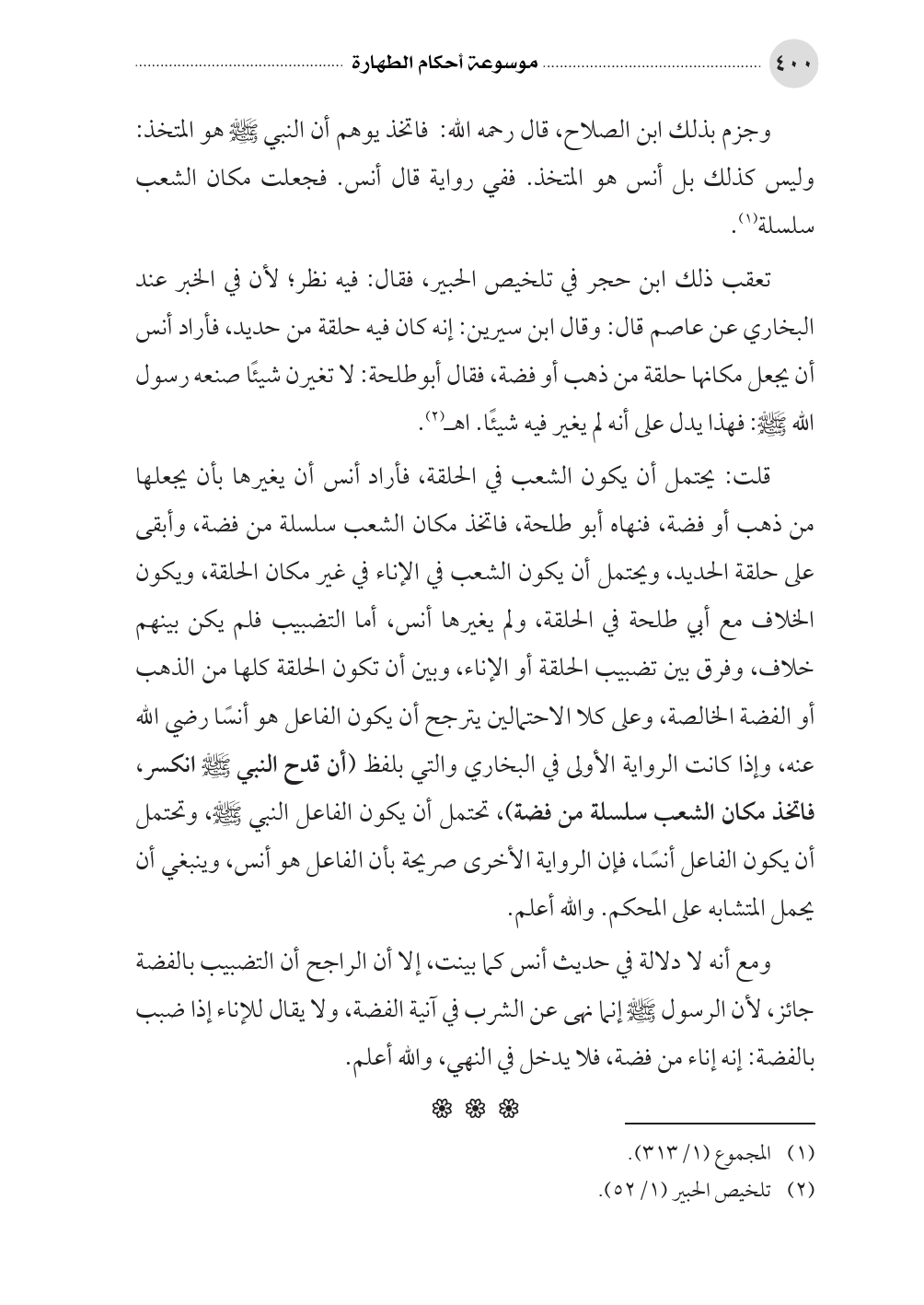 تعقب ذلك ابن حجر في تلخيص الحبير، فقال: فيه نظر؛ لأن في الخبر عند البخاري عن عاصم قال: وقال ابن سيرين: إنه كان فيه حلقة من حديد، فأراد أنس أن يجعل مكانها حلقة من ذهب أو فضة، فقال أبوطلحة: لا تغيرن شيئًا صنعه رسول الله صلى الله عليه وسلم: فهذا يدل على أنه لم يغير فيه شيئًا. اهـ (¬٢).