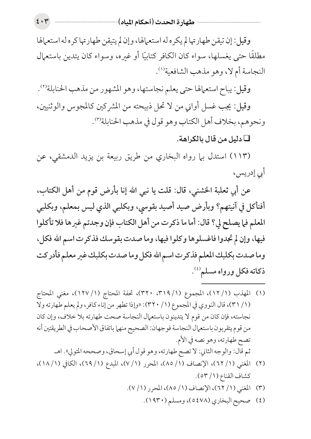 (¬١) المهذب (١/ ١٢)، المجموع (١/ ٣١٩، ٣٢٠)، تحفة المحتاج (١/ ١٢٧)، مغني المحتاج (١/ ٣١)، قال النووي في المجموع (١/ ٣٢٠): «وإذا تطهر من إناء كافر، ولم يعلم طهارته ولا نجاسته، فإن كان من قوم لا يتدينون باستعمال النجاسة صحت طهارته بلا خلاف، وإن كان من قوم يتقربون باستعمال النجاسة فوجهان: الصحيح منهما باتفاق الأصحاب في الطريقتين أنه تصح طهارته، وهو نصه في الأم.