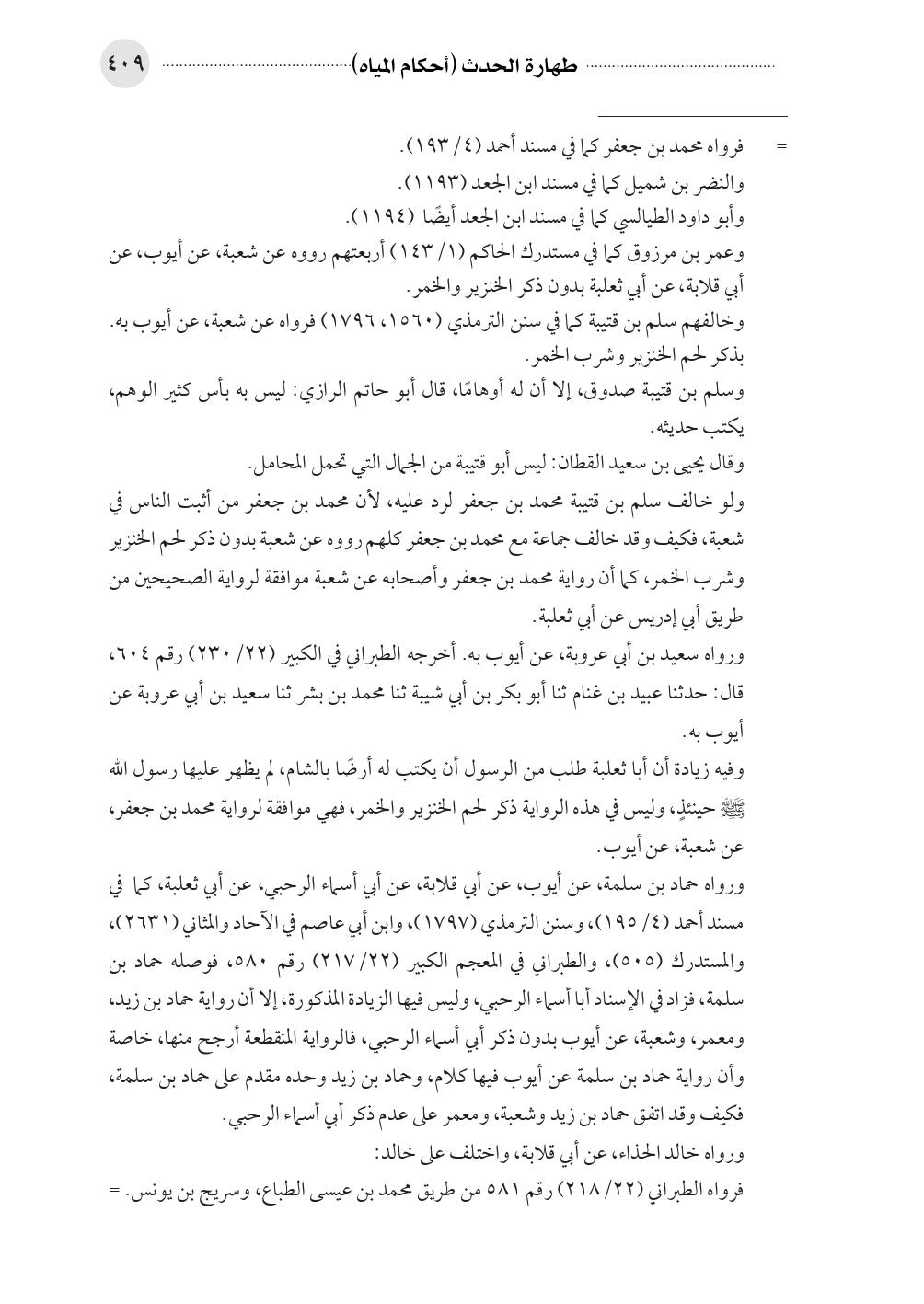 وفيه زيادة أن أبا ثعلبة طلب من الرسول أن يكتب له أرضًا بالشام، لم يظهر عليها رسول الله صلى الله عليه وسلم حينئذٍ، وليس في هذه الرواية ذكر لحم الخنزير والخمر، فهي موافقة لرواية محمد بن جعفر، عن شعبة، عن أيوب.