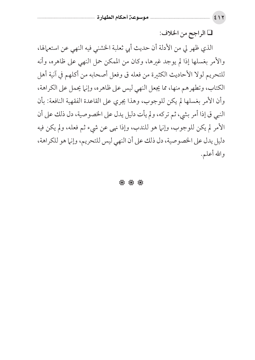 الذي ظهر لي من الأدلة أن حديث أبي ثعلبة الخشني فيه النهي عن استعمالها، والأمر بغسلها إذا لم يوجد غيرها، وكان من الممكن حمل النهي على ظاهره، وأنه للتحريم لولا الأحاديث الكثيرة من فعله ق وفعل أصحابه من أكلهم في آنية أهل الكتاب، وتطهرهم منها، مما يجعل النهي ليس على ظاهره، وإنما يحمل على الكراهة، وأن الأمر بغسلها لم يكن للوجوب، وهذا يجري على القاعدة الفقهية النافعة: بأن النبي ق إذا أمر بشي، ثم تركه، ولم يأت دليل يدل على الخصوصية، دل ذلك على أن الأمر لم يكن للوجوب، وإنما هو للندب، وإذا نهى عن شيء ثم فعله، ولم يكن فيه دليل يدل على الخصوصية، دل ذلك على أن النهي ليس للتحريم، وإنما هو للكراهة، والله أعلم.