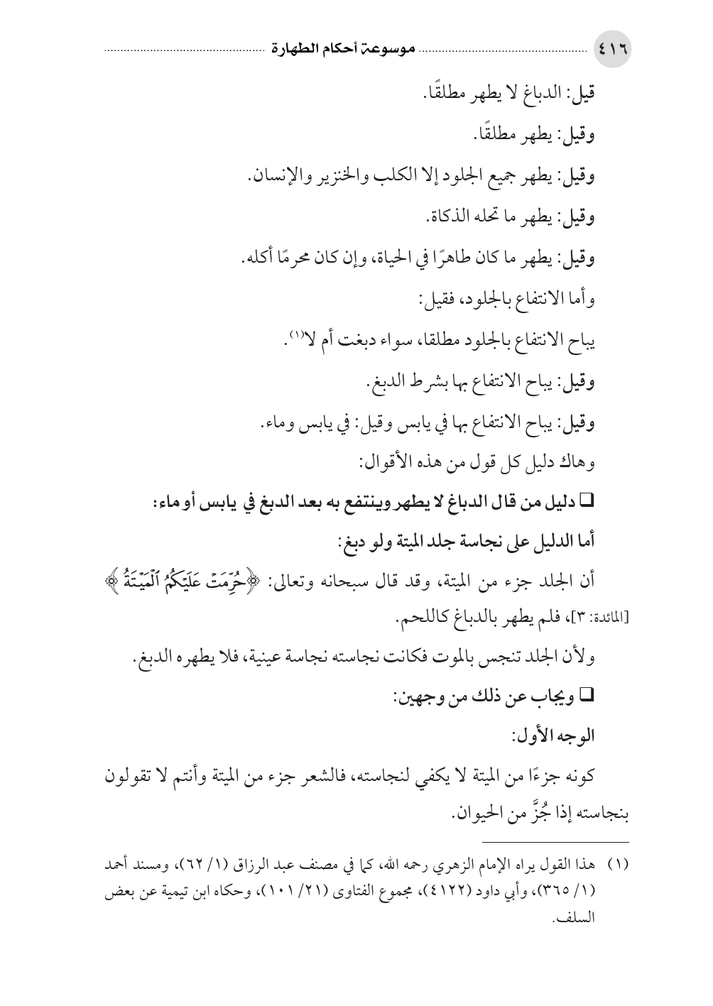 • دليل من قال الدباغ لا يطهر وينتفع به بعد الدبغ في يابس أو ماء: