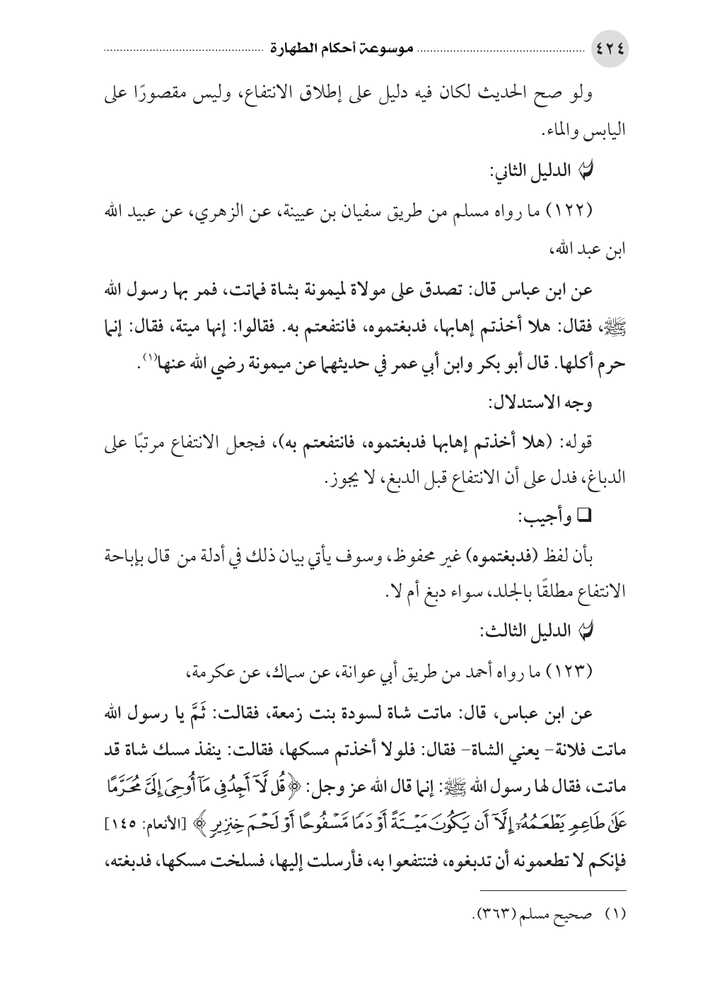 (١٢٣) ما رواه أحمد من طريق أبي عوانة، عن سماك، عن عكرمة، عن ابن عباس، قال: ماتت شاة لسودة بنت زمعة، فقالت: ثَمَّ يا رسول الله ماتت فلانة- يعني الشاة- فقال: فلولا أخذتم مسكها، فقالت: ينفذ مسك شاة قد ماتت، فقال لها رسول الله صلى الله عليه وسلم: إنما قال الله عز وجل: (قُل لَاّ أَجِدُ فِي مَا أُوْحِيَ إِلَيَّ مُحَرَّماً عَلَى طَاعِمٍ يَطْعَمُهُ إِلَاّ أَن يَكُونَ مَيْتَةً أَوْ دَماً مَّسْفُوحاً أَوْ لَحْمَ خِنزِيرٍ) [الأنعام: ١٤٥] فإنكم لا تطعمونه أن تدبغوه، فتنتفعوا به، فأرسلت إليها، فسلخت مسكها، فدبغته،