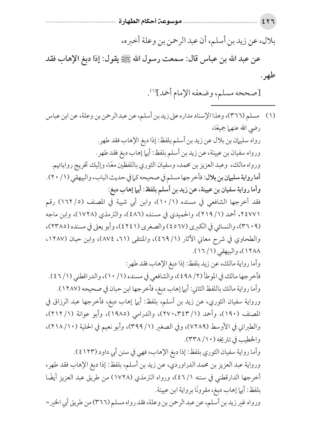 ورواية سفيان الثوري، عن زيد بن أسلم، بلفظ: أيما إهاب دبغ، فأخرجها عبد الرزاق في المصنف (١٩٠)، وأحمد (١/ ٢٧٠، ٣٤٣)، والدرامي (١٩٨٥)، وأبو عوانة (١/ ٢١٢)، والطبراني في الأوسط (٧٢٨٩)، وفي الصغير (١/ ٣٩٩)، وأبو نعيم في الحلية (١٠/ ٢١٨)، والخطيب في تاريخه (١٠/ ٣٣٨).