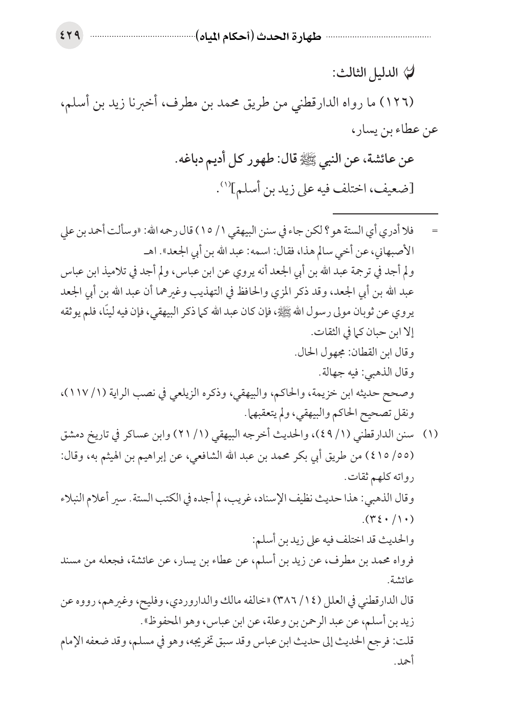 (١٢٦) ما رواه الدارقطني من طريق محمد بن مطرف، أخبرنا زيد بن أسلم، عن عطاء بن يسار، عن عائشة، عن النبي صلى الله عليه وسلم قال: طهور كل أديم دباغه.