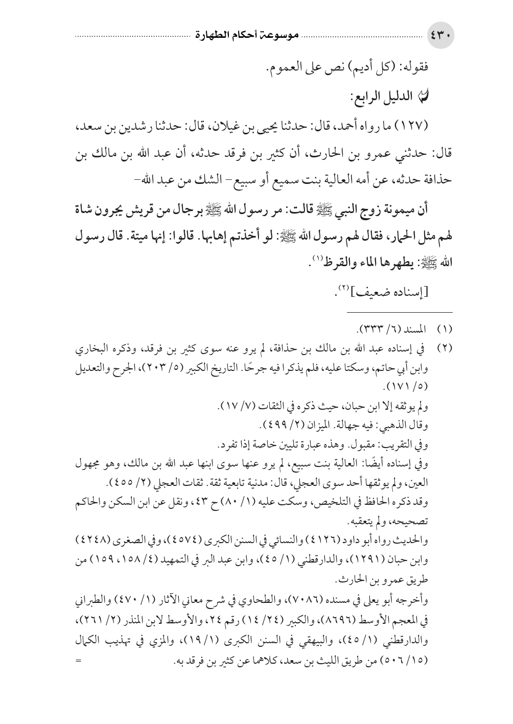 وأخرجه أبو يعلى في مسنده (٧٠٨٦)، والطحاوي في شرح معاني الآثار (١/ ٤٧٠) والطبراني في المعجم الأوسط (٨٦٩٦)، والكبير (٢٤/ ١٤) رقم ٢٤، والأوسط لابن المنذر (٢/ ٢٦١)، والدارقطني (١/ ٤٥)، والبيهقي في السنن الكبرى (١/ ١٩)، والمزي في تهذيب الكمال (١٥/ ٥٠٦) من طريق الليث بن سعد، كلاهما عن كثير بن فرقد به.