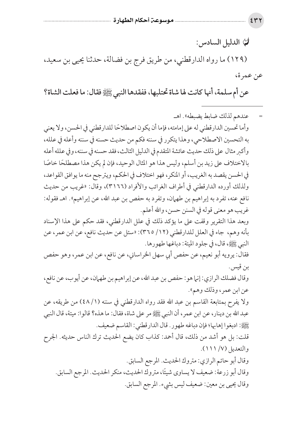 (١٢٩) ما رواه الدارقطني، من طريق فرج بن فضالة، حدثنا يحيى بن سعيد، عن عمرة، عن أم سلمة، أنها كانت لها شاة تحتلبها، ففقدها النبي صلى الله عليه وسلم فقال: ما فعلت الشاة؟