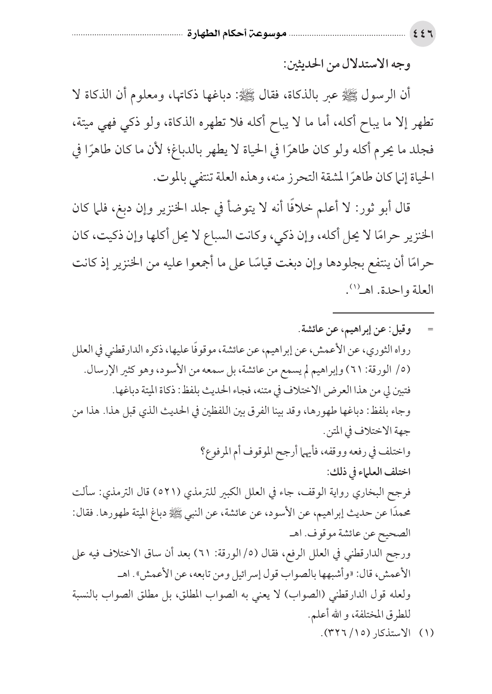 فرجح البخاري رواية الوقف، جاء في العلل الكبير للترمذي (٥٢١) قال الترمذي: سألت محمدًا عن حديث إبراهيم، عن الأسود، عن عائشة، عن النبي صلى الله عليه وسلم دباغ الميتة طهورها. فقال: الصحيح عن عائشة موقوف. اهـ