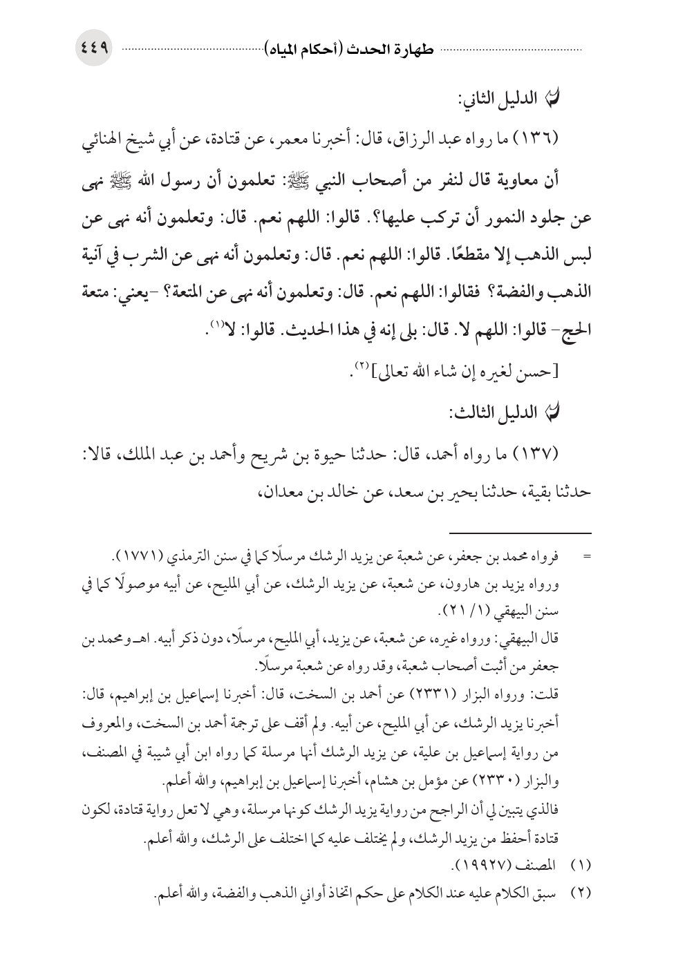 (١٣٧) ما رواه أحمد، قال: حدثنا حيوة بن شريح وأحمد بن عبد الملك، قالا: حدثنا بقية، حدثنا بحير بن سعد، عن خالد بن معدان،