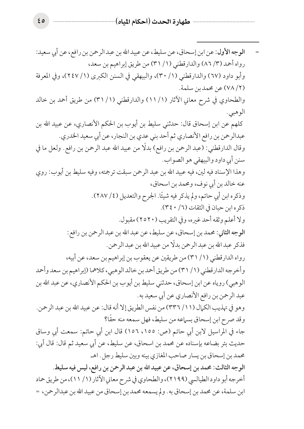 رواه الدارقطني (١/ ٣١) من طريقين عن يعقوب بن إبراهيم بن سعد، عن أبيه، وأخرجه الدارقطني (١/ ٣١) من طريق أحمد بن خالد الوهبي، كلاهما (إبراهيم بن سعد وأحمد الوهبي) روياه عن ابن إسحاق، حدثني سليط بن أيوب بن الحكم الأنصاري، عن عبد الله بن عبد الرحمن بن رافع الأنصاري عن أبي سعيد به.