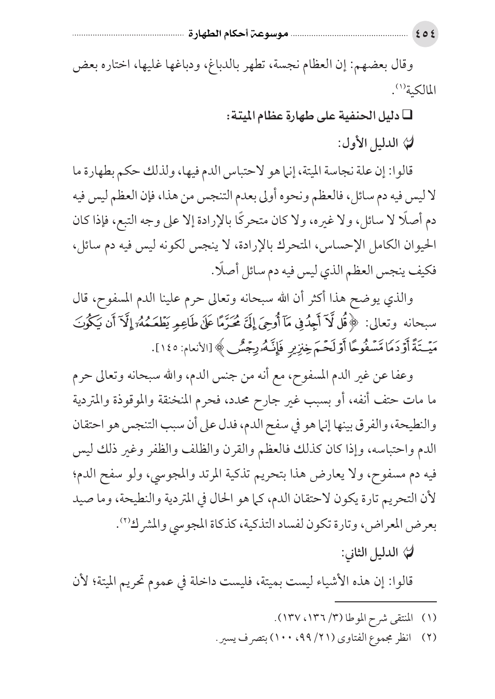 قالوا: إن علة نجاسة الميتة، إنما هو لاحتباس الدم فيها، ولذلك حكم بطهارة ما لا ليس فيه دم سائل، فالعظم ونحوه أولى بعدم التنجس من هذا، فإن العظم ليس فيه دم أصلًا لا سائل، ولا غيره، ولا كان متحركًا بالإرادة إلا على وجه التبع، فإذا كان الحيوان الكامل الإحساس، المتحرك بالإرادة، لا ينجس لكونه ليس فيه دم سائل، فكيف ينجس العظم الذي ليس فيه دم سائل أصلًا.