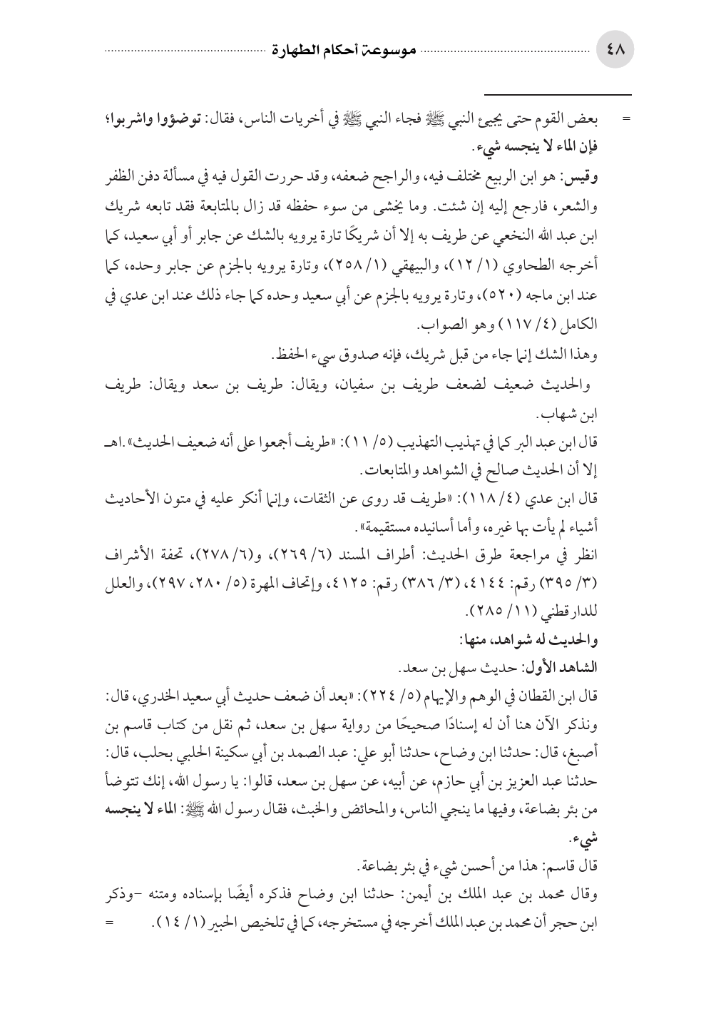قال ابن القطان في الوهم والإيهام (٥/ ٢٢٤): «بعد أن ضعف حديث أبي سعيد الخدري، قال: ونذكر الآن هنا أن له إسنادًا صحيحًا من رواية سهل بن سعد، ثم نقل من كتاب قاسم بن أصبغ، قال: حدثنا ابن وضاح، حدثنا أبو علي: عبد الصمد بن أبي سكينة الحلبي بحلب، قال: حدثنا عبد العزيز بن أبي حازم، عن أبيه، عن سهل بن سعد، قالوا: يا رسول الله، إنك تتوضأ من بئر بضاعة، وفيها ما ينجي الناس، والمحائض والخبث، فقال رسول الله صلى الله عليه وسلم: الماء لا ينجسه شيء.