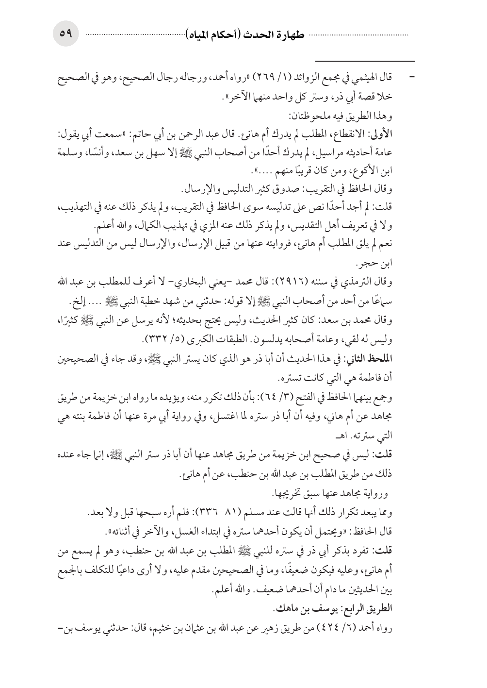 الأولى: الانقطاع، المطلب لم يدرك أم هانئ. قال عبد الرحمن بن أبي حاتم: «سمعت أبي يقول: عامة أحاديثه مراسيل، لم يدرك أحدًا من أصحاب النبي صلى الله عليه وسلم إلا سهل بن سعد، وأنسًا، وسلمة ابن الأكوع، ومن كان قريبًا منهم .... ».