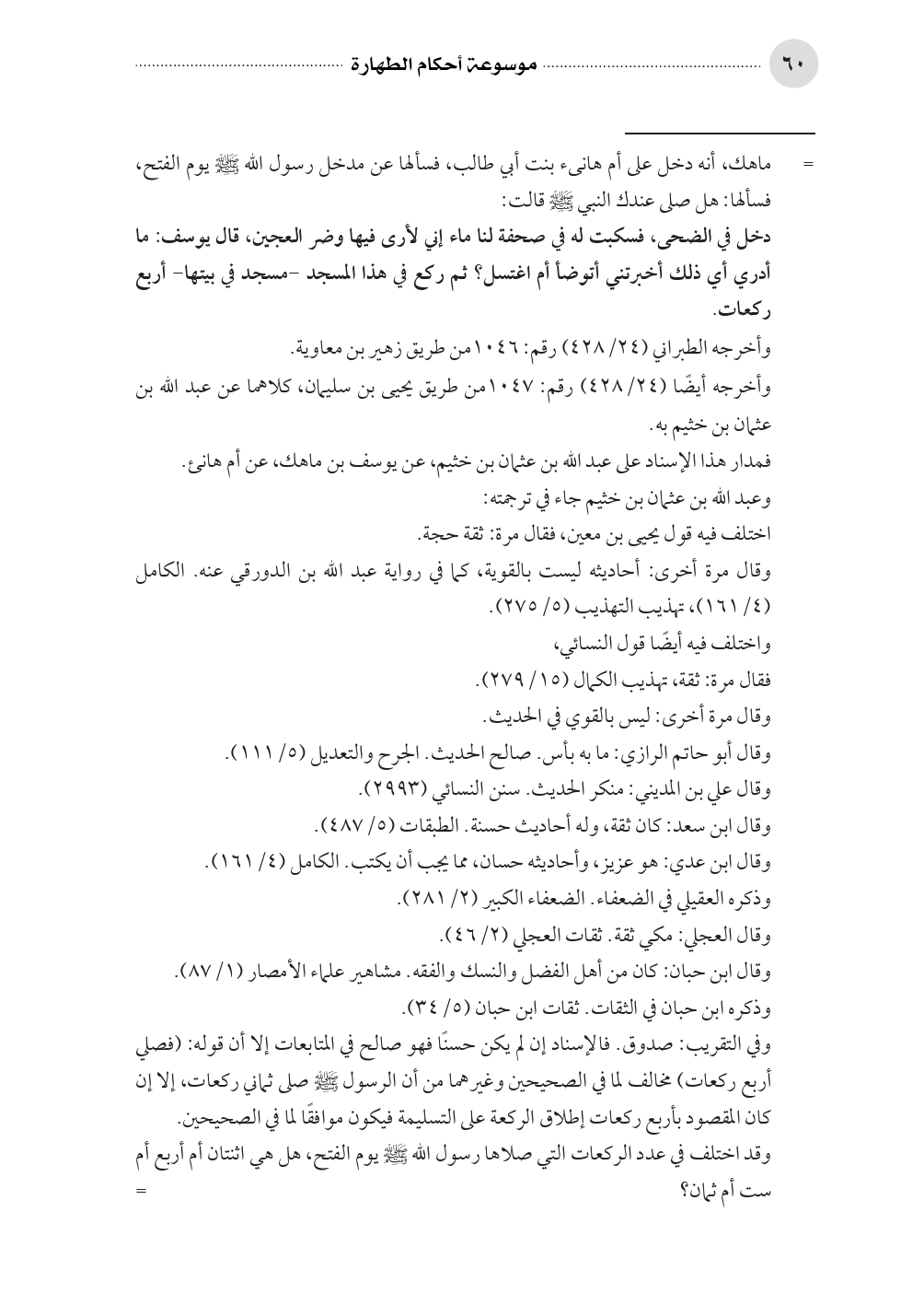 وفي التقريب: صدوق. فالإسناد إن لم يكن حسنًا فهو صالح في المتابعات إلا أن قوله: (فصلي أربع ركعات) مخالف لما في الصحيحين وغيرهما من أن الرسول صلى الله عليه وسلم صلى ثماني ركعات، إلا إن كان المقصود بأربع ركعات إطلاق الركعة على التسليمة فيكون موافقًا لما في الصحيحين.