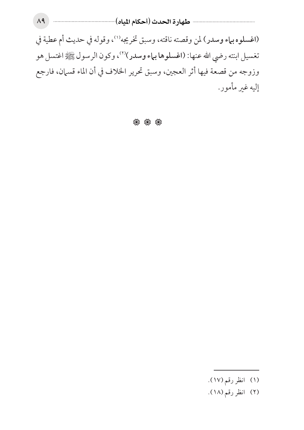 (اغسلوه بماء وسدر) لمن وقصته ناقته، وسبق تخريجه (¬١)، وقوله في حديث أم عطية في تغسيل ابنته رضي الله عنها: (اغسلوها بماء وسدر) (¬٢)، وكون الرسول صلى الله عليه وسلم اغتسل هو وزوجه من قصعة فيها أثر العجين، وسبق تحرير الخلاف في أن الماء قسمان، فارجع إليه غير مأمور.