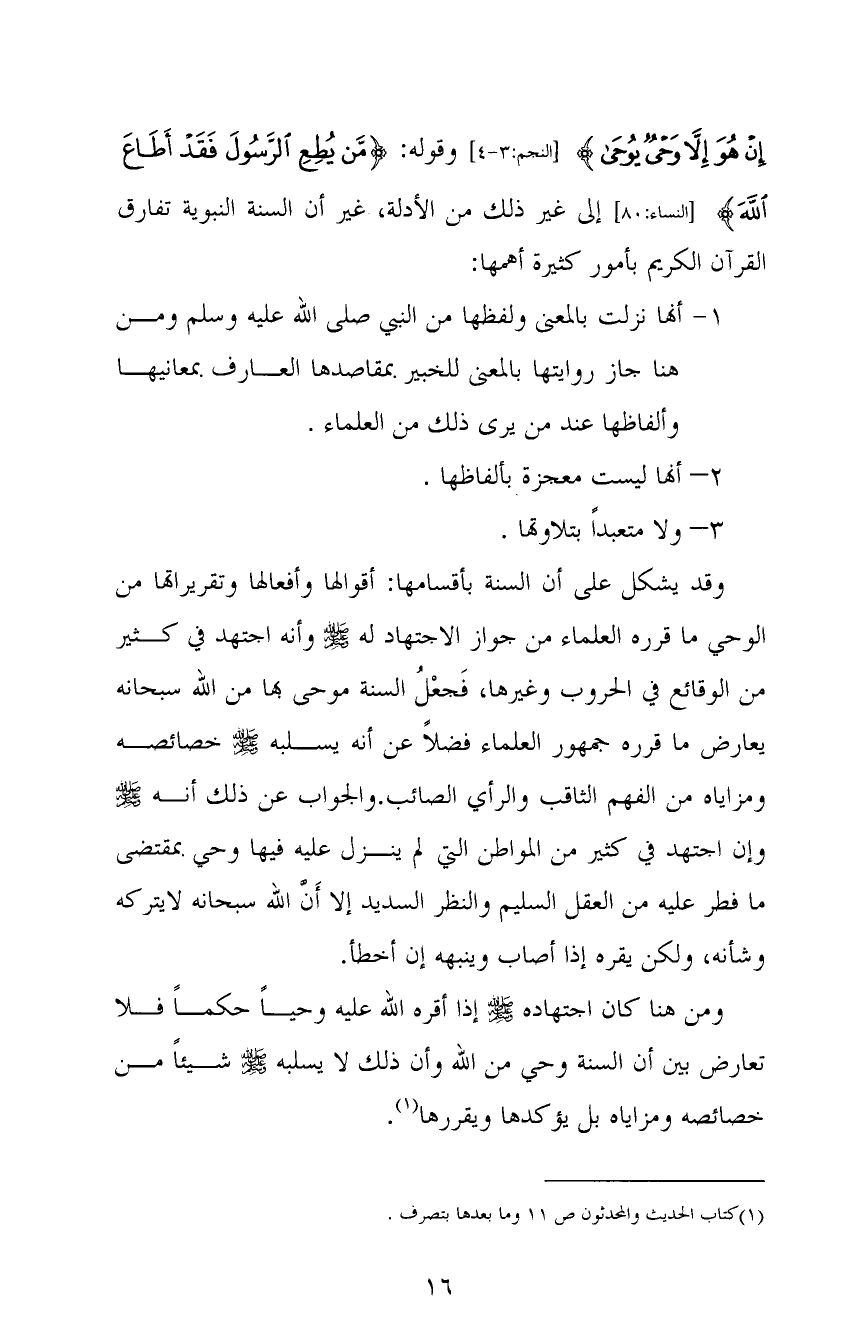,إِنْ هُوَ إِلَّا وَحْيٌ يُوحَى} [النجم:3-4] وقوله: {مَنْ يُطِعِ الرَّسُولَ فَقَدْ أَطَاعَ اللَّهَ} [النساء:80] إلى غير ذلك من الأدلة، غير أن السنة النبوية تفارق القرآن الكريم بأمور كثيرة أهمها: