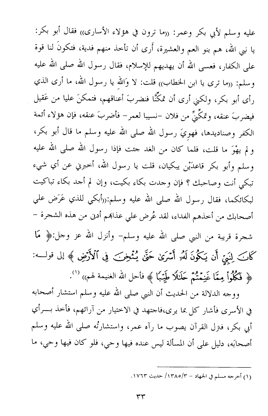 عليه وسلم لأبي بكر وعمر: "ما ترون في هؤلاء الأسارى" فقال أبو بكر: يا نبي الله، هم بنو العم والعشيرة، أَرى أن تأخذ منهم فدية، فتكونَ لنا قوة على الكفار، فعسى الله أن يهديهم للإسلام، فقال رسول الله صلى الله عليه وسلم: "ما ترى يا ابن الخطاب" قلت: لا وَاللهِ يا رسول الله، ما أرى الذي رأى أبو بكر، ولكني أرى أن تمكِّنَّا فنضربَ أعناقهم، فتمكنَ عليا من عَقيل فيضربَ عنقه، وتمكِّنيِّ من فلان -نسيبا لعمر- فأضربَ عنقه، فإن هؤلاء أئمة الكفر وصناديدها، فهوِيَ رسول الله صلى الله عليه وسلم ما قال أبو بكر، ولم يهْوَ ما قلت، فلما كان من الغد جئت فإذا رسول الله صلى الله عليه وسلم وأبو بكر قاعدَيْن يبكيان، قلت يا رسول الله، أخبرني عن أي شيء تبكي أنت وصاحبك؟ فإن وجدت بكاء بكيت، وإن لم أجد بكاء تباكيت لبكائكما، فقال رسول الله صلى الله عليه وسلم: "أبكي للذي عَرَض علي أصحابك من أخذهم الفداء، لقد عُرض علي عذابهم أدنى من هذه الشجرة" -شجرة قريبة من النبي صلى الله عليه وسلم- وأنزل الله عز وجل: {مَا كَانَ لِنَبِيٍّ أَنْ يَكُونَ لَهُ أَسْرَى حَتَّى يُثْخِنَ فِي الْأَرْضِ} إلى قوله: {فَكُلُوا مِمَّا غَنِمْتُمْ حَلالاً طَيِّباً} [الأنفال:69] فأحل الله الغنيمة لهم" (1) .