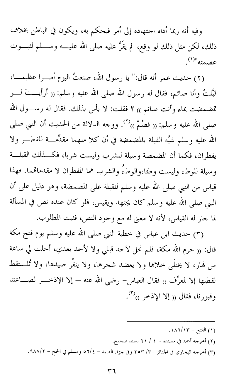 (2) حديث عمر أنه قال:" يا رسول الله، صنعتُ اليوم أمرا عظيما، قبَّلتُ وأنا صائم، فقال له رسول الله صلى الله عليه وسلم: " أرأيتَ لو تمضمضت بماء وأنت صائم "؟ فقلت: لا بأس بذلك. فقال له رسول الله صلى الله عليه وسلم: " فصُمْ " (2) . ووجه الدلالة من الحديث أن النبي صلى الله عليه وسلم شبَّه القبلة بالمضمضة في أن كلا منهما مقدِّمة للفطر ولا يفطران، فكما أن المضمضة وسيلة للشرب وليست شربا، فكذلك القبلة وسيلة للوطء وليست وطئا، والوطءُ والشرب هما المفطران لا مقدماتهما. فهذا قياس من النبي صلى الله عليه وسلم للقبلة على المضمضة، وهو دليل على أن النبي صلى الله عليه وسلم كان يجتهد ويقيس، فلو كان عنده نص في المسألة لما جاز له القياس، لأنه لا معنى له مع وجود النص، فثبت المطلوب.