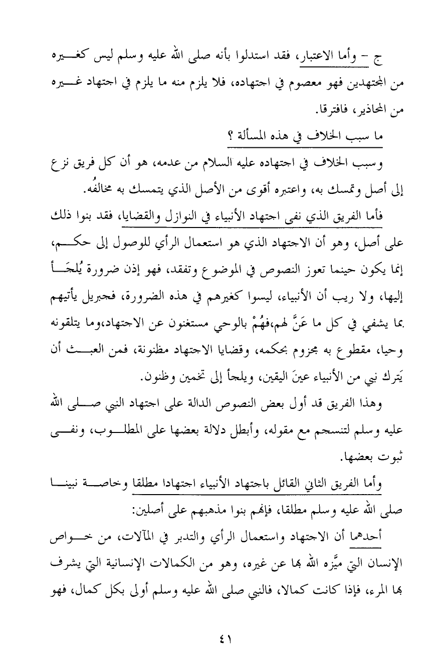 ج - وأما الاعتبار، فقد استدلوا بأنه صلى الله عليه وسلم ليس كغيره من المجتهدين فهو معصوم في اجتهاده، فلا يلزم منه ما يلزم في اجتهاد غيره من المحاذير، فافترقا.