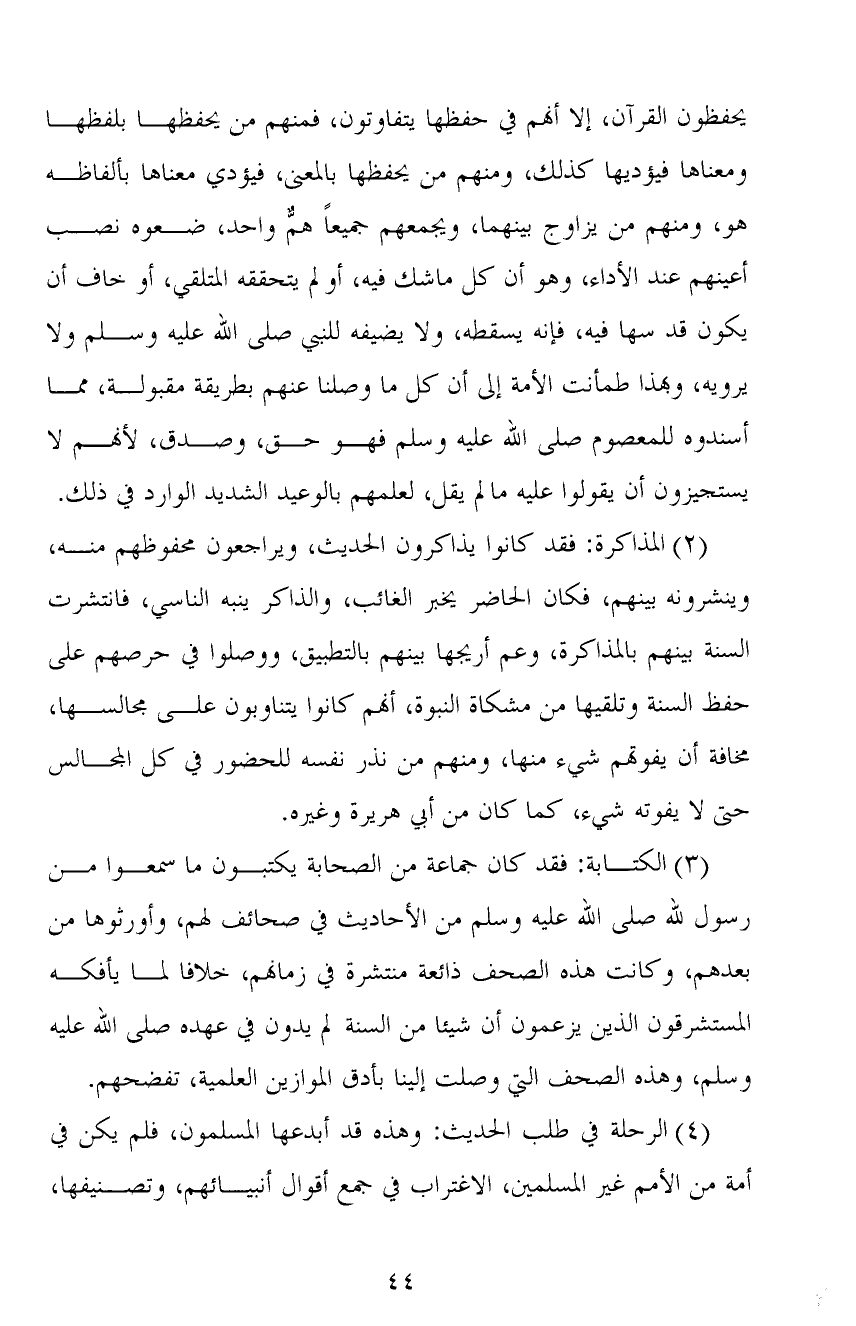 (3) الكتابة: فقد كان جماعة من الصحابة يكتبون ما سمعوا من رسول لله صلى الله عليه وسلم من الأحاديث في صحائف لهم، وأورثوها من بعدهم، وكانت هذه الصحف ذائعة منتشرة في زمانهم، خلافا لما يأفكه المستشرقون الذين يزعمون أن شيئا من السنة لم يدون في عهده صلى الله عليه وسلم، وهذه الصحف التي وصلت إلينا بأدق الموازين العلمية، تفضحهم.