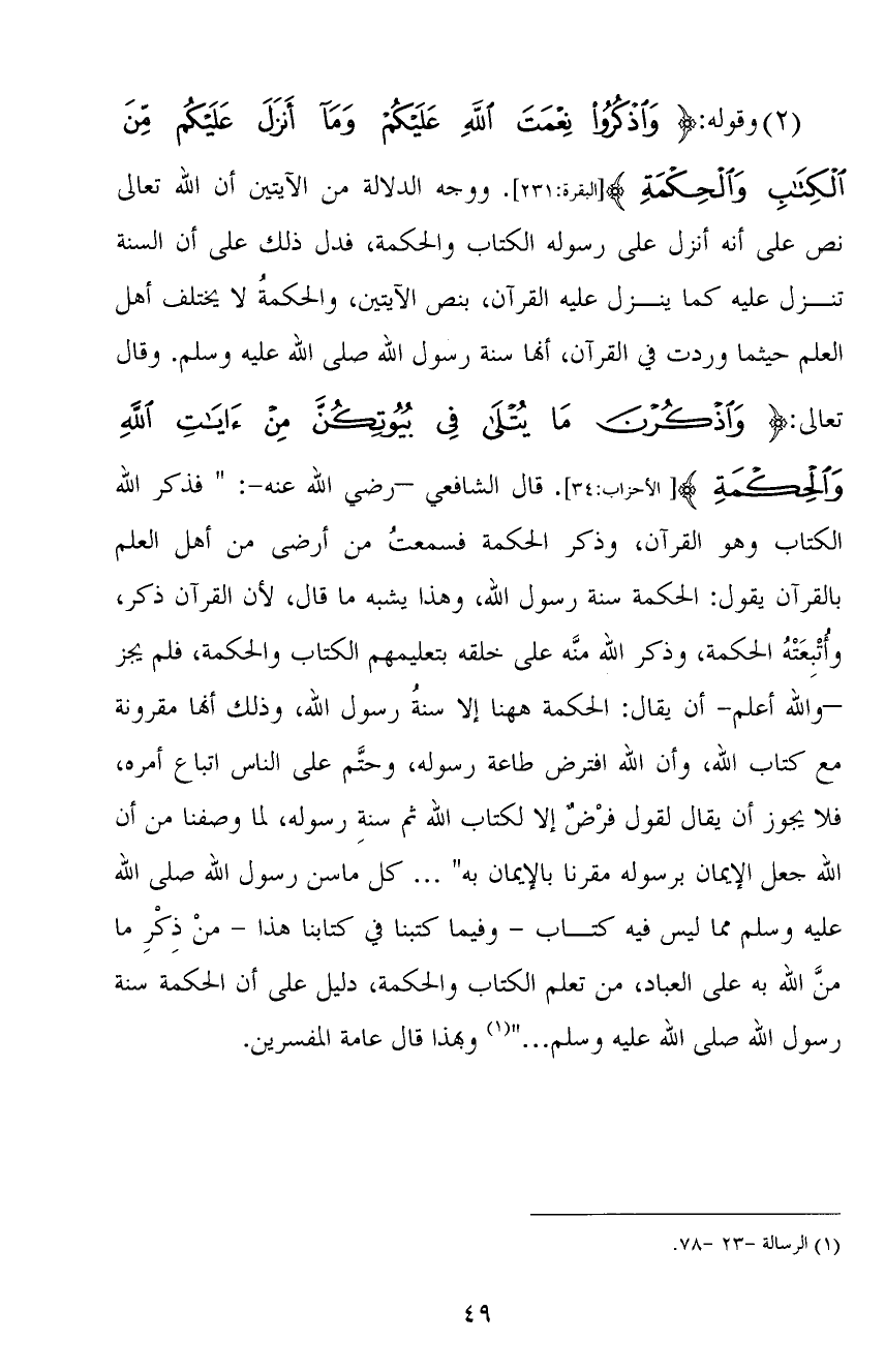 (1) وقوله {وَاذْكُرُوا نِعْمَتَ اللَّهِ عَلَيْكُمْ وَمَا أَنْزَلَ عَلَيْكُمْ مِنَ الْكِتَابِ وَالْحِكْمَةِ} [البقرة:231] . ووجه الدلالة من الآيتين أن الله تعالى نص على أنه أنزل على رسوله الكتاب والحكمة، فدل ذلك على أن السنة تنزل عليه كما ينزل عليه القرآن، بنص الآيتين، والحكمةُ لا يختلف أهل العلم حيثما وردت في القرآن، أنها سنة رسول الله صلى الله عليه وسلم. وقال تعالى: {وَاذْكُرْنَ مَا يُتْلَى فِي بُيُوتِكُنَّ مِنْ آيَاتِ اللَّهِ وَالْحِكْمَةِ} [الأحزاب:34] . قال الشافعي –رضي الله عنه-: " فذكر الله الكتاب وهو القرآن، وذكر الحكمة فسمعتُ من أرضى من أهل العلم بالقرآن يقول: الحكمة سنة رسول الله، وهذا يشبه ما قال، لأن القرآن ذكر، وأُتْبِعَتْهُ الحكمة، وذكر الله منَّه على خلقه بتعليمهم الكتاب والحكمة، فلم يجز –والله أعلم- أن يقال: الحكمة ههنا إلا سنةُ رسول الله، وذلك أنها مقرونة مع كتاب الله، وأن الله افترض طاعة رسوله، وحتَّم على الناس اتباع أمره، فلا يجوز أن يقال لقول فرْضٌ إلا لكتاب الله ثم سنةِ رسوله، لما وصفنا من أن الله جعل الإيمان برسوله مقرنا بالإيمان به" ... كل ماسن رسول الله صلى الله عليه وسلم مما ليس فيه كتاب - وفيما كتبنا في كتابنا هذا - منْ ذِكْرِ ما منَّ الله به على العباد، من تعلم الكتاب والحكمة، دليل على أن الحكمة سنة رسول الله صلى الله عليه وسلم ... " (1) وبهذا قال عامة المفسرين.