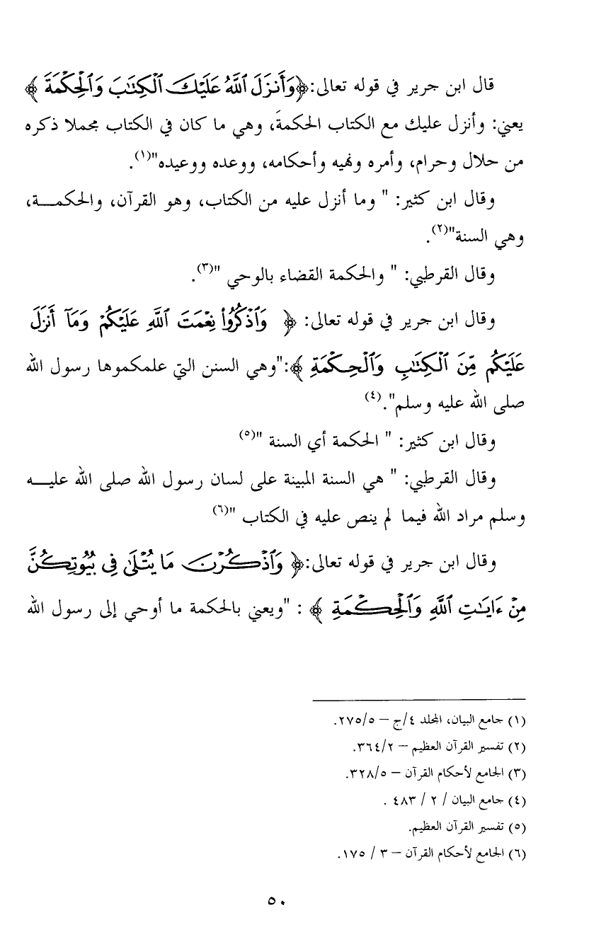 قال ابن جرير في قوله تعالى {وَأَنْزَلَ اللَّهُ عَلَيْكَ الْكِتَابَ وَالْحِكْمَةَ} [النساء:118] يعني: وأنزل عليك مع الكتاب الحكمةَ، وهي ما كان في الكتاب مجملا ذكره من حلال وحرام، وأمره ونهيه وأحكامه، ووعده ووعيده" (1) .