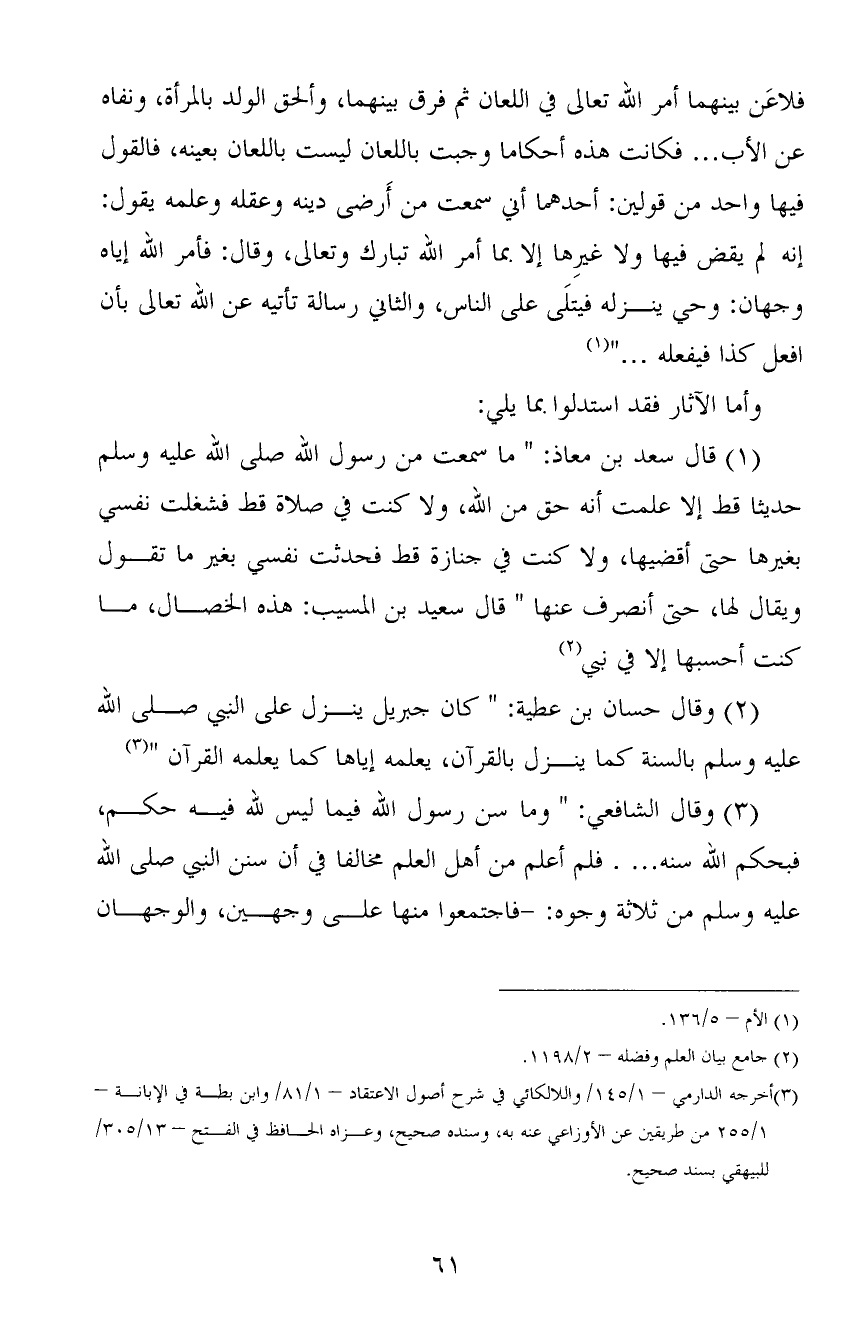 (3) أخرجه الدارمي – 1/145/ واللالكائي في شرح أصول الاعتقاد – 1/81/ وابن بطة في الإبانة – 1/255 من طريقين عن الأوزاعي عنه به، وسنده صحيح، وعزاه الحافظ في الفتح – 13/305/ للبيهقي بسند صحيح.