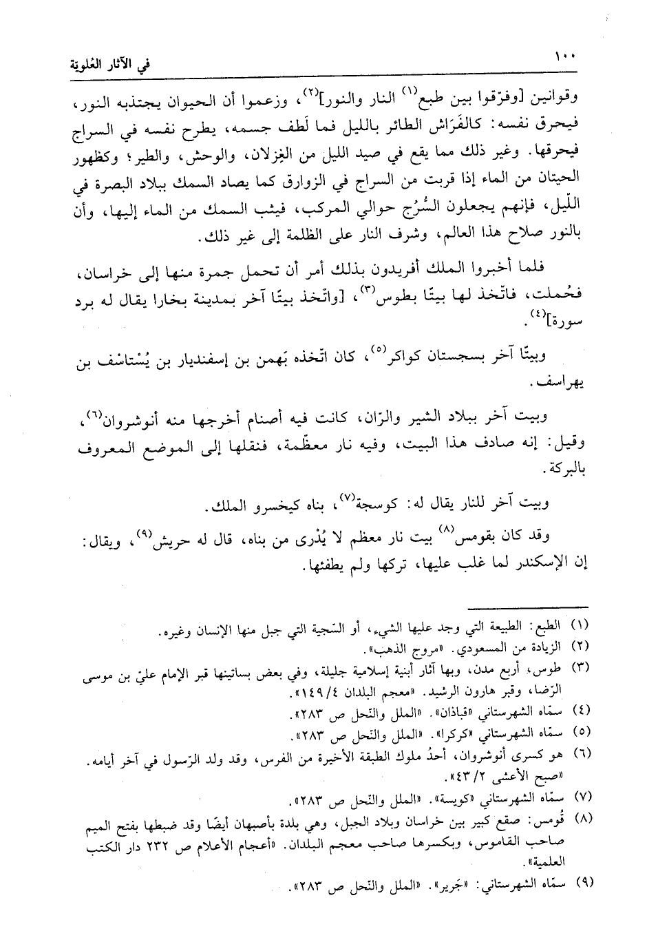 وقوانين " وفرقوا بين طبع النار والنور " وزعموا أن الحيوان يجتذبه النور ، فيحرق نفسه : كالفراش الطائر بالليل فما لطف جسمه ، ويطرح نفسه في السراج فيحرقها . وغير ذلك مما يقع في صيد الليل من الغزلان ، والوحش ، والطير ، وكظهور الحيتان في الماء إذا قربت من السراج في الزوارق كما يصاد السمك ببلاد البصرة في الليل ، فإنهم يجعلون السرج حوالي المركب ، فيثب السمك من الماء إليها ؛ وان النور صلاح هذا العالم ، وشرف النار على الظلمة إلى غير ذلك .