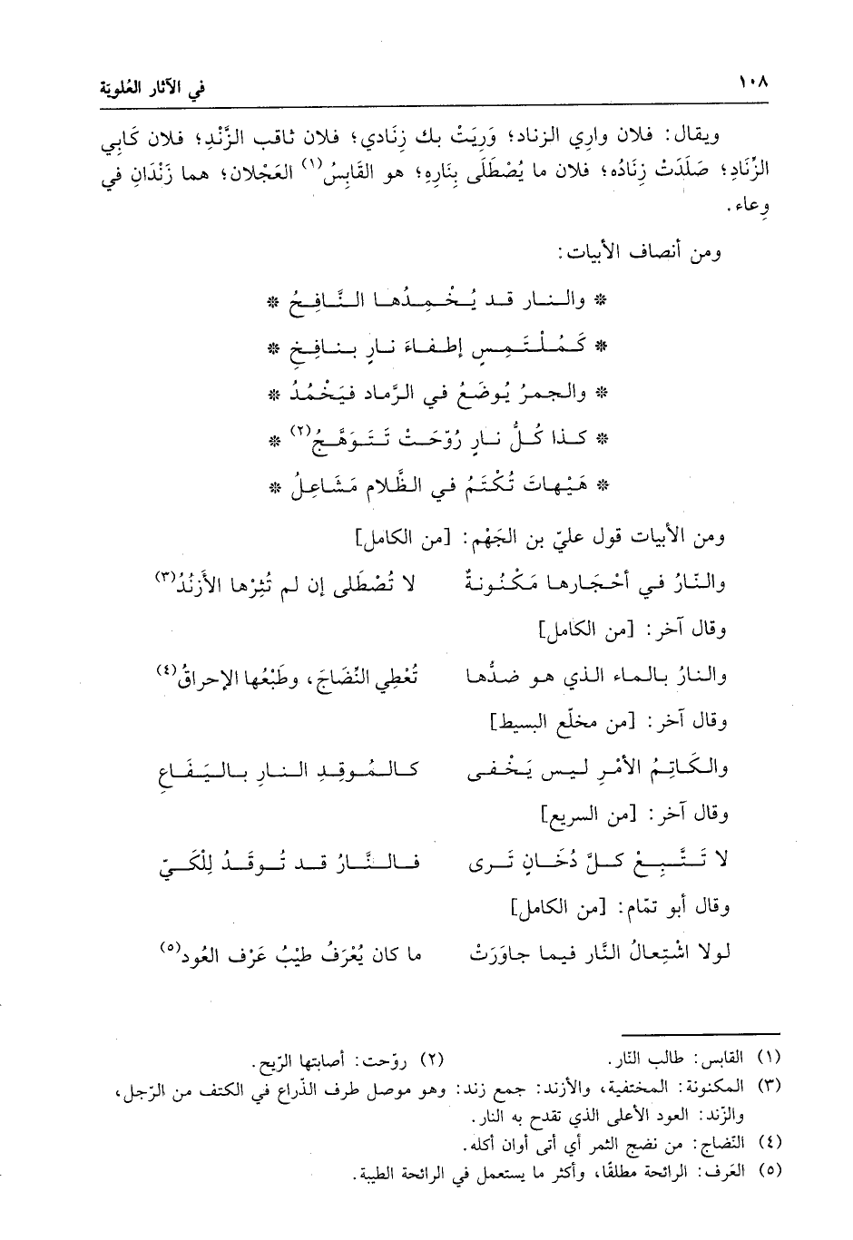 ويقال : فلان واري الزناد ؛ وريت بك زنادي ؛ فلان ثاقب الزند ؛ فلان كابي الزناد ؛ صلدت زناده ؛ فلام يصطلى بناره ؛ هو القابس العجلان ؛ هما زندان في وعاء .