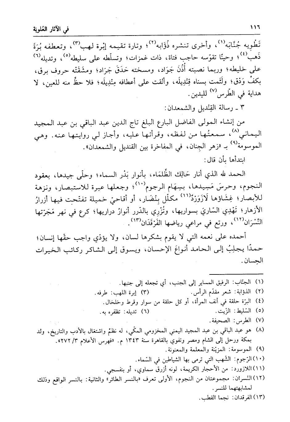 رسالة القنديل والشمعدان . من إنشاء الولى الفاضل البارع البليغ تاج الدين عبد الباقي بن عبد المجيد اليماني ، سمعتها من لفظه ، وقرأتها عليه ، وأجاز لي روايتها عنه ، وهي الموسومة بزهر الجنان ، في المفاخرة بين القنديل والشمعدان .