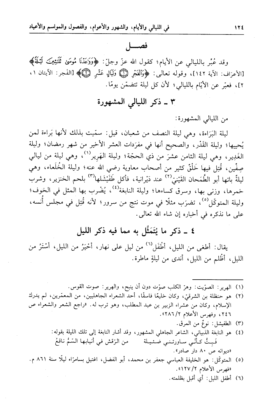 وقد عبر الليالي عن الأيام ، كقول الله عز وجل : " وواعدنا موسى ثلاثين ليلة " ؛ وقوله تعالى : " والفجر وليال عشر " . فعبر عن الأيام بالليالي ، لأن كل ليلة تتضمن يوماً .