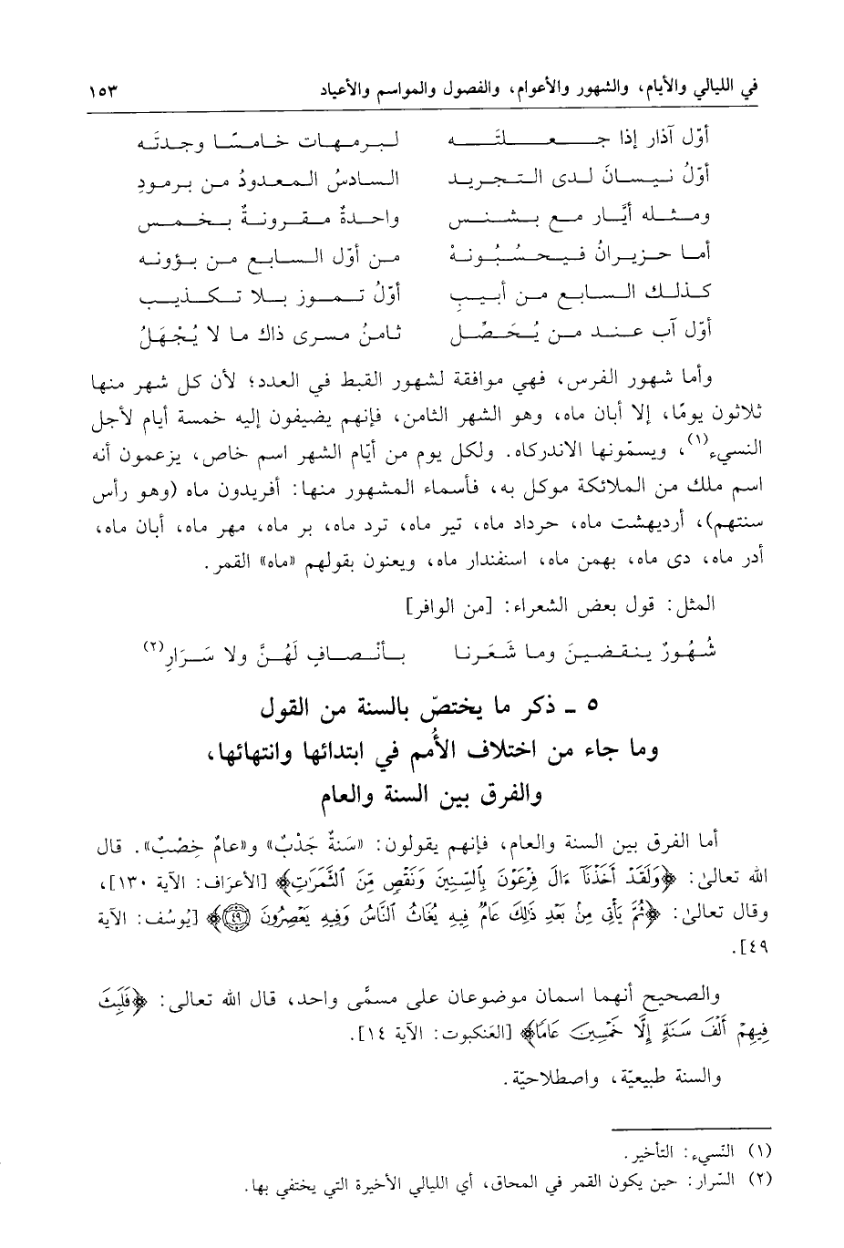 5 - ذكر ما يختص بالسنة من القول وما جاء من اختلاف الأمم في ابتدائها وانتهائها ، والفرق بين السنة والعام