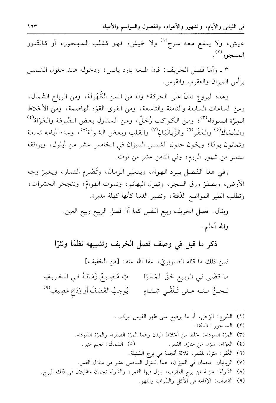 وفي هذا الفصل يبرد الهواء ، ويتغير الزمان ، ويغبر وجه الأرض ، ويصفر ورق الشجر ، وتهزل البهائم ، وتموت الهوام ، وتنحجر الحشرات ، وتطلب الطير المواضع الدفئة ، وتصير الدنيا كأنها كهلة مدبرة .