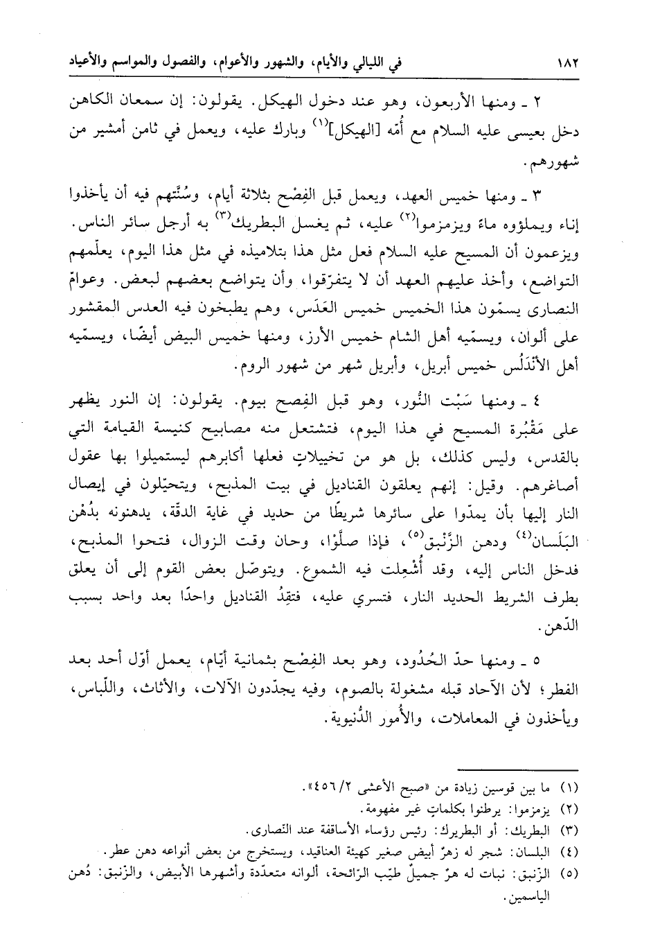 ومنها خميس العهد . ويعمل قبل الفصح بثلاثة أيام . وسنتهم فيه أن يأخذوا إناء ويملؤوه ماء ويزمزموا عليه ، ثم يغسل البطريك به أرجل سائر الناس . ويزعمون أن المسيح عيسى غليه السلام فعل مثل هذا بتلاميذه في مثل هذا اليوم ، يعلمهم التواضع ، وأخذ عليهم العهد أن لا يتفرقوا ، وأن يتواضع بعضهم لبعض . وعوام النصارى يسمون هذا الخميس خميس العدس ، وهم يطبخون فيه العدس المقشور على ألوان ، ويسميه أهل الشام خميس الأرز . ومنها خميس البيض أيضاً . ويسميه أهل الأندلس خميس أبريل ، وأبريل شهر من شهور الروم . ومنها سبت النور . وهو قبل الفصح بيوم . يقولون إن النور يظهر على مقبرة المسيح في هذا اليوم ، فتشتعل منه مصابيح كنيسة القيامة التي بالقدس . وليس كذلك ، بل هو من تخييلات فعلها أكابرهم ليستميلوا بها عقول أصاغرهم . وقيل إنهم يعلقون القناديل في بيت المذبح ، ويتحيلون في إيصال النار إليها بأن يمدوا على سائرها شريطاً من حديد في غاية الدقة ، يدهنونه بدهن البلسان ودهن الزنبق . فإذا صلوا وحان وقت الزوال ، فتحوا المذبح ، فدخل الناس إليه ، وقد أشعلت فيه الشموع . ويتوصل بعض القوم إلى أن يعلق بطرف الشريط الحديد النار فتسري عليه ، فتقد القناديل واحدا بعد واحد بسبب الدهن .