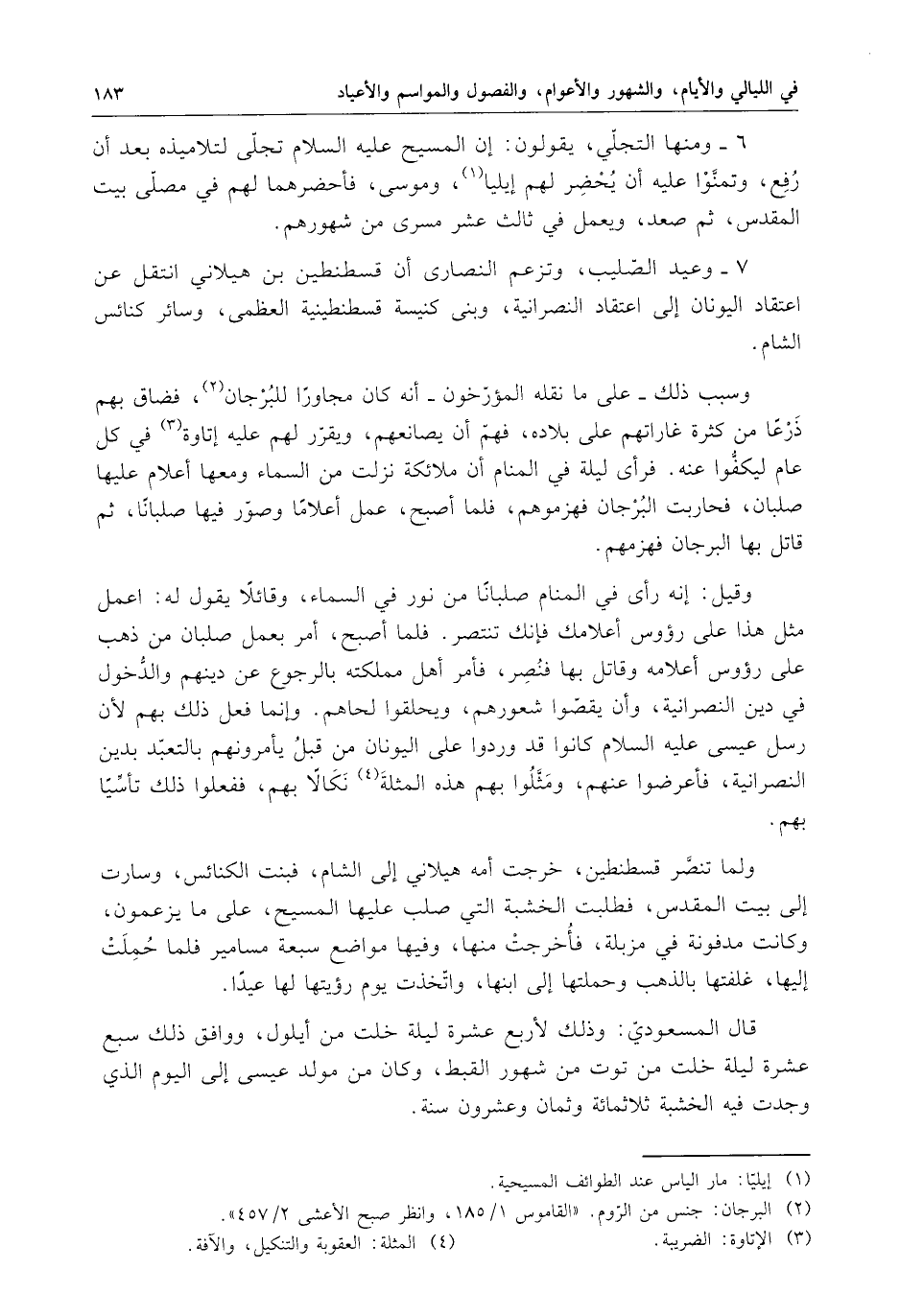 وعيد الصليب . وتزعم النصارى أن قسطنطين بن هيلاني انتقل عن اعتقاد اليونان إلى اعتقاد النصرانية ، وبنى كنيسة قسطنطينية العظمى ، وسائر كنائس الشام .