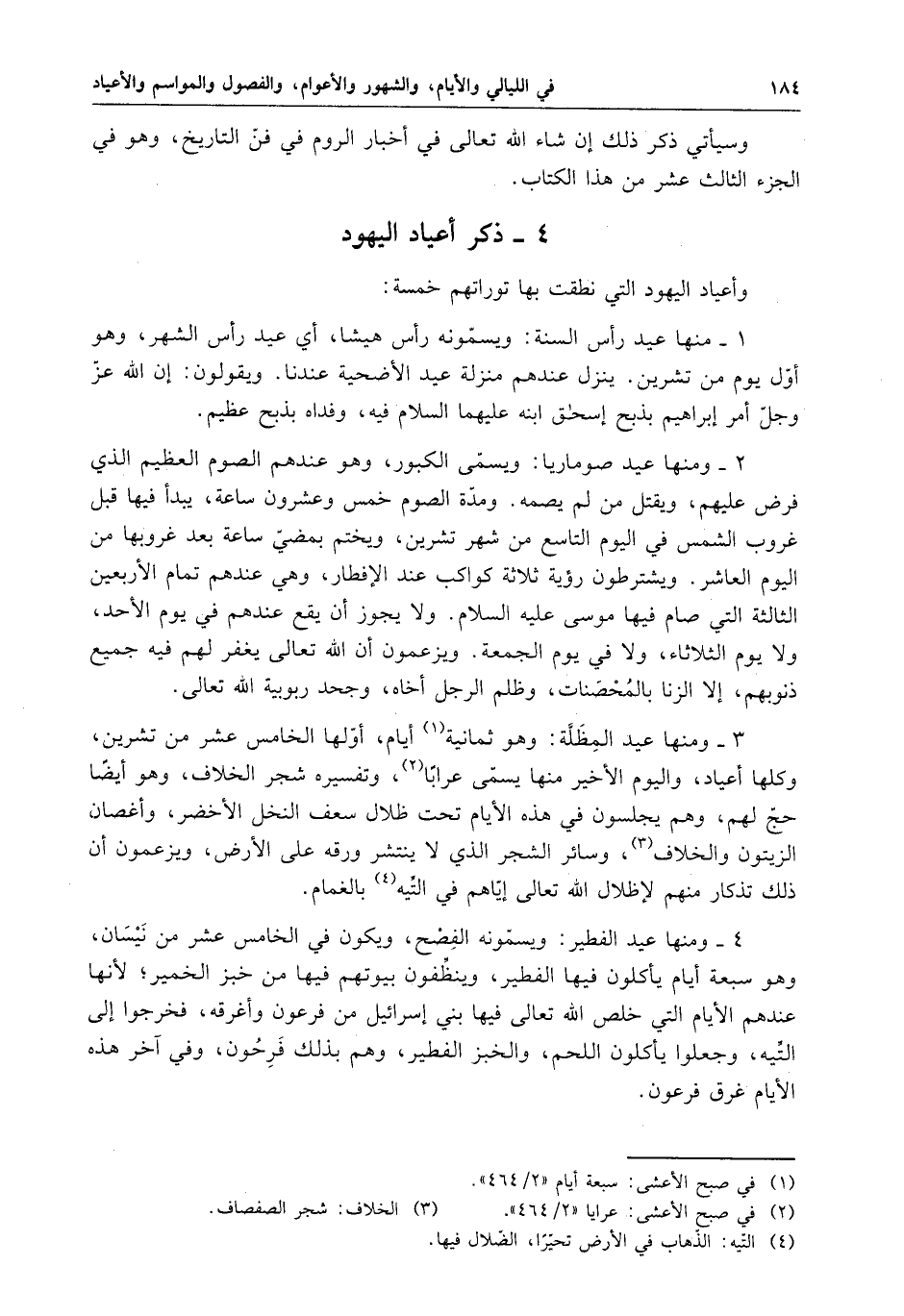 ومنها عيد الفطير . ويسمونه الفصح . ويكون في الخامس عشر من نيسان . وهو سبعة أيام يأكلون فيها الفطير ، وينظفون بيوتهم فيها من خبز الخمير . لأنها عندهم الأيام التي خلص الله تعالى فيها بني إسرائيل من فرعون وأغرقه ، فخرجوا إلى التيه ، وجعلوا يأكلون اللحم ، والخبز الفطير ، وهم بذلك فرحون . وفي آخر هذه الأيام غرق فرعون .
