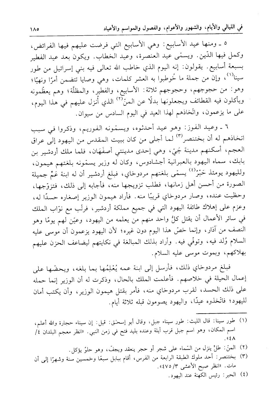 وعيد الفوز . وهو عيد أحدثوه ، ويسمونه الفوريم . وذكروا في سبب اتخاذهم له بختنصر لما أجلى من كان ببيت المقدس من اليهود إلى عراق العجم ، أسكنهم مدينة جي ، وهي إحدى مدينتي أصفهان . فلما ملك أردشير بن بابك ، سماه اليهود بالعبرانية أجشادوس . وكان له وزير يسمونه بلغتهم هيمون . ولليهود يومئذ حبر يسمى بلغتهم مردوخاني . فبلع أردشير أن له ابنة عم جميلة الصورة من أحسن أهل زمانها . فطلب تزويجها منه ، فأجابه إلى ذلك . فتزوجها ، وحظيت عنده ، وصار مردوخاي قريباً منه . فأراد هيمون الوزير إصغاره حسداً ، وعزم على إهلاك طائفة اليهود التي في جميع مملكة أردشير . فرتب مع نواب الملك في سائر الأعمال أن يقتل كل واحد منهم من يعلمه من اليهود . وعين لهم يوم وهو النصف من آذار . وإنما خص هذا اليوم دون غيره ، لأن اليهود يزعمون أن موسى عليه السلام ولد فيه وتوفي فيه . وأراد بذلك المبالغة في نكايتهم ليضاعف الحزن عليهم بهلاكهم ، وبموت موسى عليه السلام .