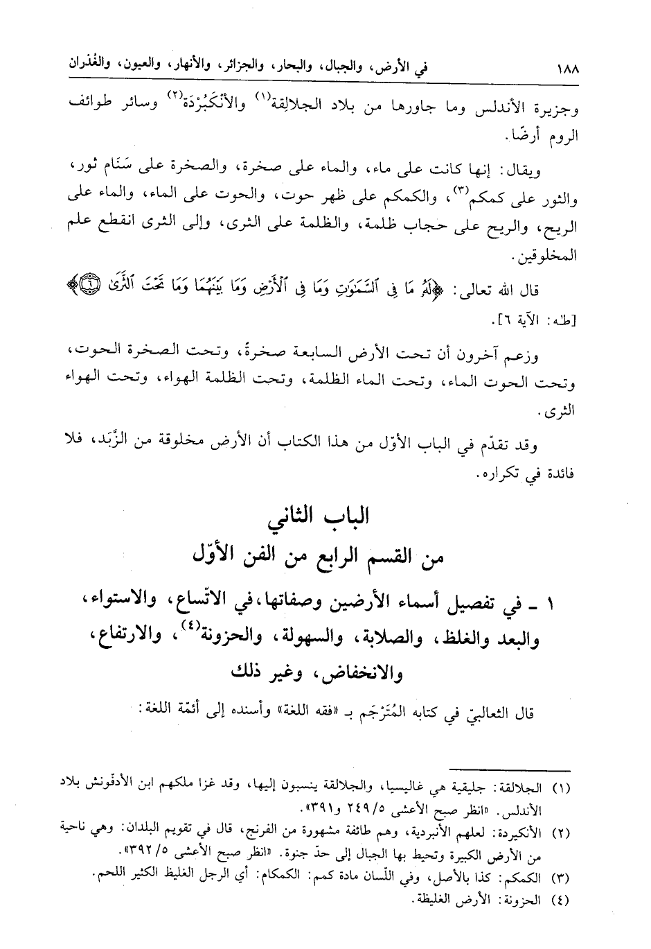 - في تفصيل أسماء الأرضين وصفاتها في الاتساع ، والاستواء ، والبعد ، والغلظ ، والصلابة ، والسهولة ، والخزونة ، والارتفاع ، والانخفاض ، وغير ذلك