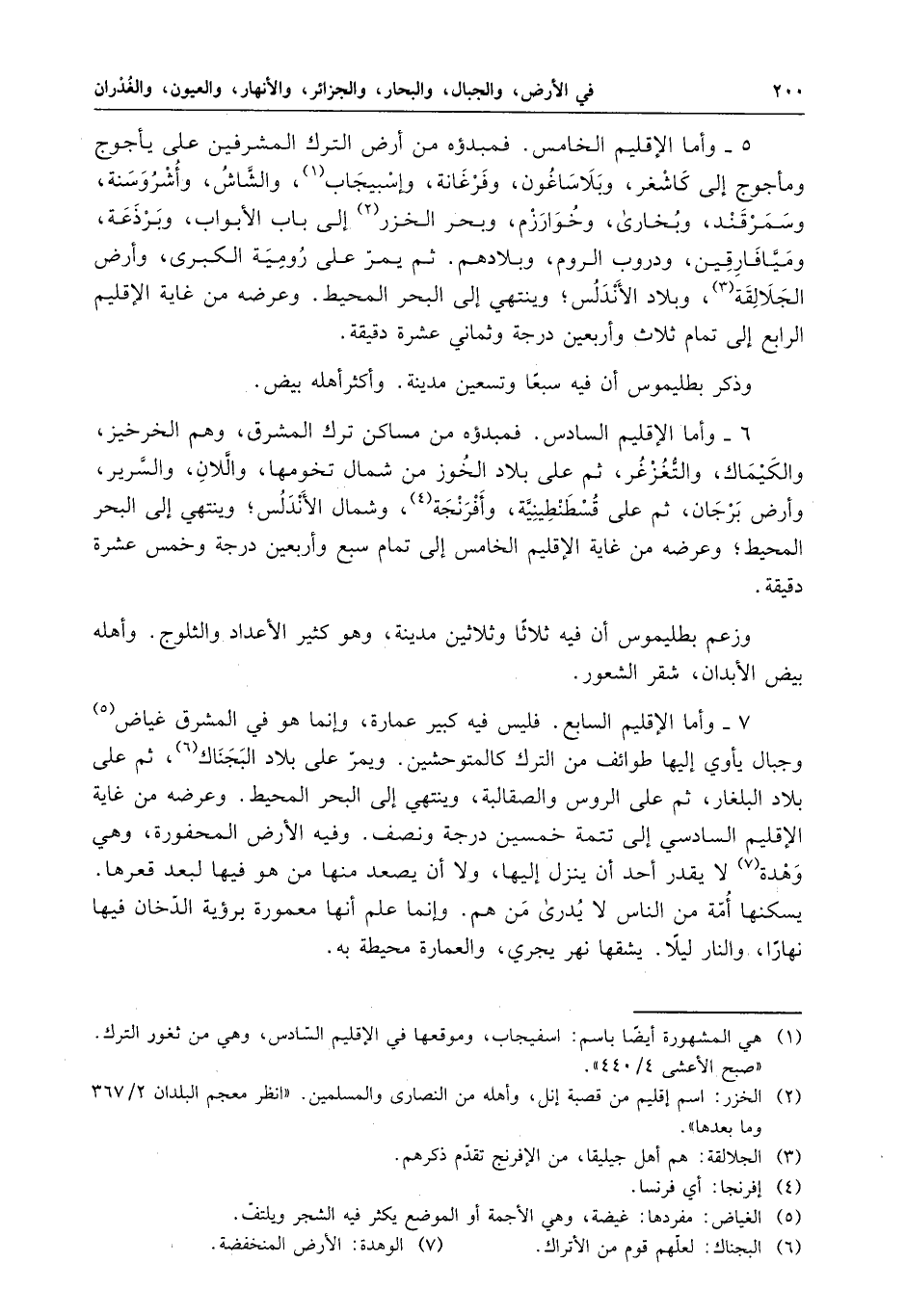 وأما الإقليم السادس فمبدؤه من مساكن ترك المشرق ، وهم الخرخيز ، والكيمال ، والتغزغز ، ثم على بلاد الخوز من شمال تخومها ، واللان ، والسرير ، وأرض برجان ، ثم على قسطنطينية ، وأفرنجة ، وشمال الأندلس ، وينتهي إلى البحر المحيط ؛ وعرضه من غاية الأقليم الخامس إلى تمام سبعة وأربعين درجة وخمسة عشر دقيقة .