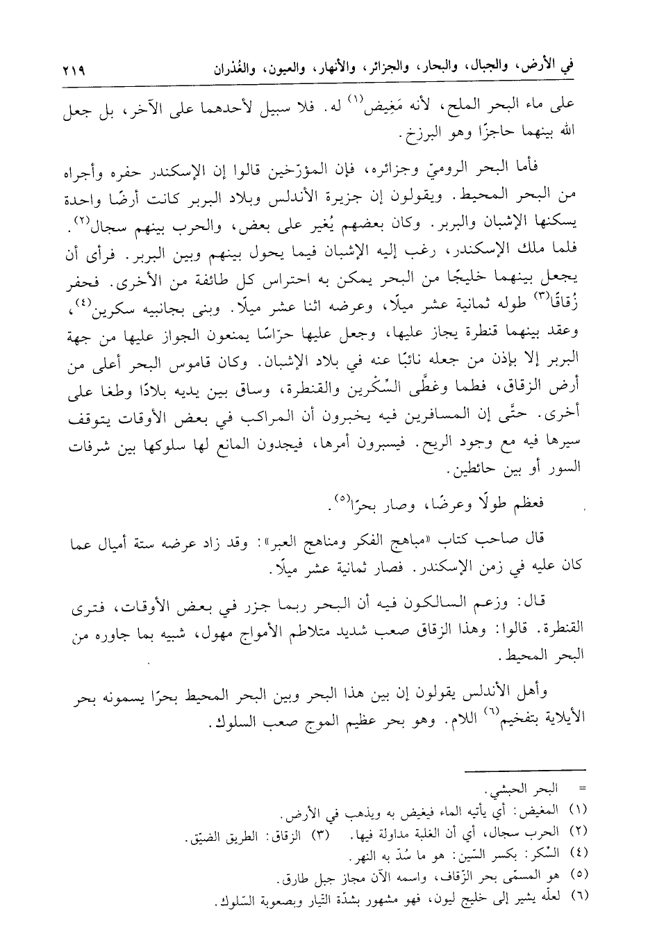 على ماء البحر الملح ، لأنه مغيض له . فلا سبيل لأحدهما على الآخر ، بل جعل الله بينهما حاجزا وهو البرزخ . فإما البحر الرومي وجزائره ، فإن المؤرخين قالوا إن الإسكندر حفره وأجراه من البحر المحيط . يقولون إن جزيرة الأندلس وبلاد البربر أرضا واحدة يسكنها الإشبان والبربر . وكان بعضهم يغير على بعض ، والحرب بينهم سجال . فلما ملك الإسكندر ، رغب إليه فيما يحول بينهم وبين البربر . فرأى أن يجعل بينهما خليجا من البحر يمكن به احتراس كل طائفة من الأخرى . فحفر زقاقا طوله ثمانية عشر ميلا ، وعرضه اثنا عشر ميلا . وبنى بجانبيه سكرين ، وعقد بينهما قنطرة يجاز عليها ، وجعل عليها حراسا يمنعون الجوار عليها من جهة البربر إلا بإذن من جعله ناثبا عنه في بلاد الإشبان . وكان قاموس البحر أعلى من أرض الزقاق ، فطما وغطى السكرين والقنطرة ، وساق بين يديه بلادا وطغا على أخرى . حتى إن المسافرين فيه يخبرون أن المراكب في بعض الأوقات يتوقف سيرها فيه مع وجود الريح . فيسبرون أمرها ؛ فيجدون المانع لها سلوكها بين شرفات السور أو بين حائطين .