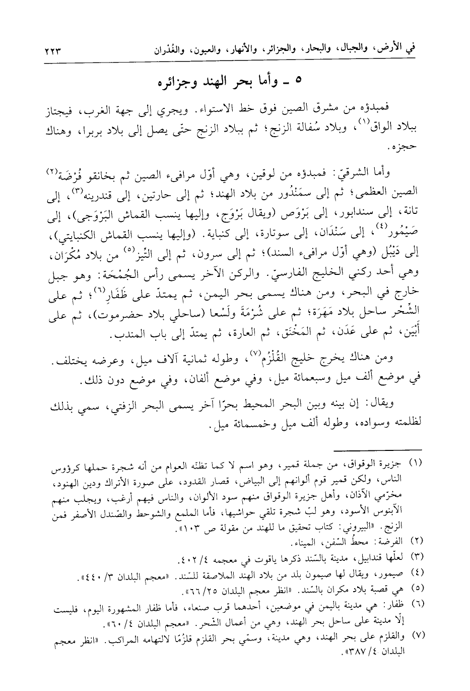 ومن هناك يخرج خليج القلزم ، وطوله ثمانية آلاف ميل ، وعرضه يختلف . في موضع ألف ميل وسبعمائة ميل ، وفي موضع ألفان ، وفي موضع دون ذلك .