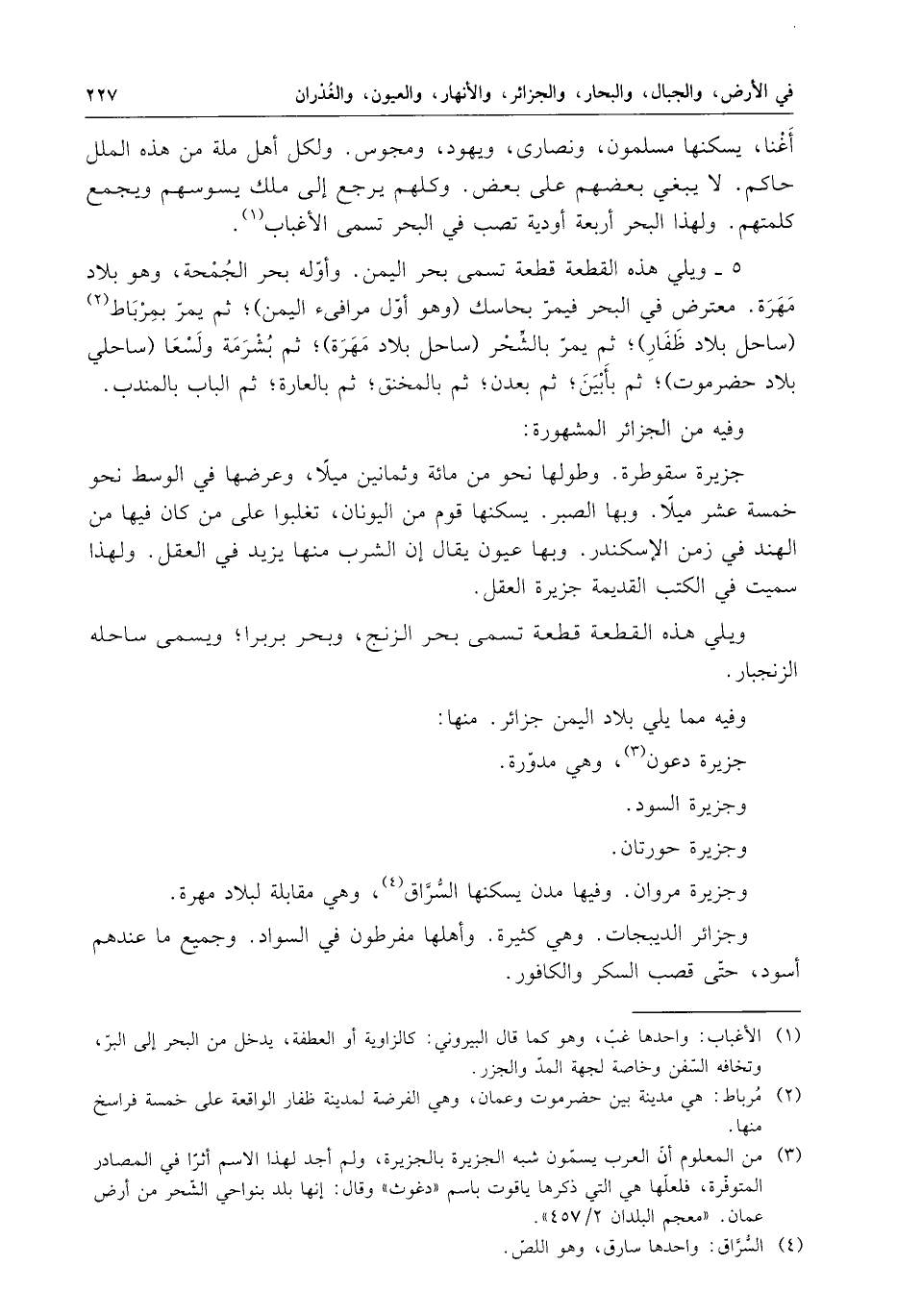 وفيه من الجزائر المشهورة : جزيرة سقوطرة . وطولها نحو من مائة وثمانين ميلا ، وعرضها في الوسط نحو خمسة عشر ميلا . وبها الصبر . يسكنها قوم من اليونان ، تغلبوا على من كان فيها من الهند في زمن الإسكندر . وبها عيون يقال إن الشراب منها يزيد في العقل .