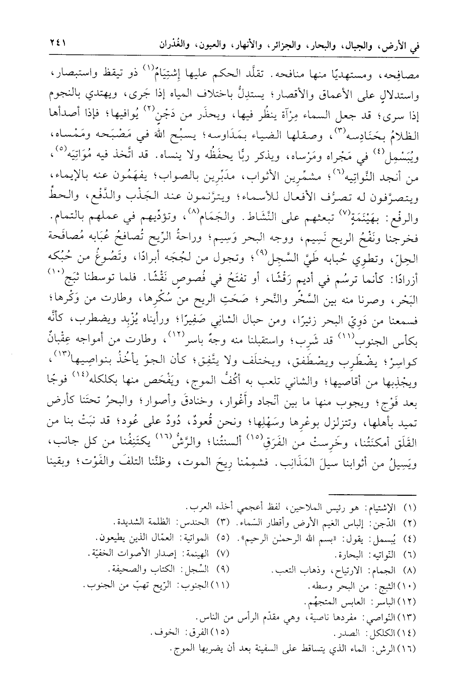 مصافحه ، ومستهديا منها منافخة . تقلد الحكم عليها إشتيام ذو تيقظ واستبصار ، واستدلال على الأعماق والأقصار ؛ يستدل باختلاف المياه إذا جرى ، ويهتدي بالنجوم إذا سرى ؛ قد جعل السماء مرآة ينظر فيها ، ويحذر من دجن يوافيها ؛ فإذا أصدأها الظلام بحنادسه ، وصقلها الضياء بمداوسه ، يسبح الله فيمصبحه وممساه ، ويبسمل في مجراه ومرساه ، ويذكر ربا يحفظه ولا ينساه . قد اتخذ فيه مولتيه ، من أنجد النواتية ؛ مشمرين الأثواب ، مدبرين بالصواب ؛ يفهمون عنه بالإيماء ، ويتصرفون له تصرف الأفعال للأسماء ؛ ويترنمون عند الجذب والدفع ، والحط والرفع : بهيمنة تبعثهم على النشاط . والجمام ، وتؤديهم في عملهم بالتمام . فخرجنا ونفح الريح نسيم ، ووجه البحر وسيم ؛ وراحة الريح تصافح عبابه مصافحة الخل ، وتطوي جناحه طي السجل ؛ وتجول من لججه أبرادا ، وتصوغ منحبكه أزرادا : كأنما ترسم في أديم رقشا ، أو تفتح في فصوص نقشا . قلما توسطنا ثبج البحر ، وصرنا منه بين السحر والنحر ؛ صحت الريح من سكرها ، وطارت من وكرها ؛ فسمعنا من ددوي البحر زئرا ، ومن جبال الشاني صفيرا ؛ ورأيناه يزبد ويضطرب ، كأنه بكأس الجنوب قد شرب ؛ واستقبلنا منه وجه باسر ، وطارت من أمواجه عقبان كواسر ؛ يضطرب ويصطفق ، ويختلف ولا يتفق ؛ كأن الجو يأخذ بنواصيها ، ويجدبها من أقاصيها ؛ والشاني تلعب به أكف الموج ، ويفحص منها بكلكله فوجا بعد فوج ؛ ويجوب منها ما بين أنجاد وأغوار ، وخنادق وأسوار ؛ والبحر تحتتنا كأرض تميد بأهلها ، وتتزلزل بوعرها وسهلها ؛ ونحن قعود ، دود على عود ؛ قد نبت بنا من القلق أمكنتنا ، وخرست من الفرق ألستنا ؛ والرش يكتفنا من كل جانب ، ويسيل من أثوابنا سيل المذانب . فشممنا ريح الموت وظننا التلف والفوت ؛ وبقينا