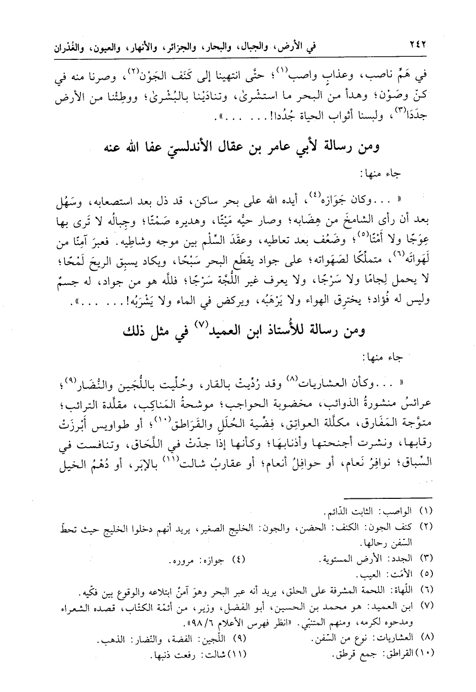 جاء منها : وكان جوازه ، أيده الله على بحر ساكن ، قد ذل بعد استصعابه ، وسهل بعد أن رأى الشامخ من هضابه ؛ وصار حيه ميتا ، وهديره صمتا ؛ وجباله لا ترى بها عوجا ولا أمتا ، وضعف بعد تعاطيه ، وعقد السلم بين موجه وشاطيه . فعبر آمناً من لهواته ، ممتلكاً لصهواته ؛ على جواد يقطع البحر سبحا ، ويكاد يسبق الريح لمحا ؛ لا يحمل لجاماً ولا سراجا ، ولا يعرف غير اللجة سرجا ؛ فلله هو من جواد ، له جسم وليس له فؤداً ؛ يخترق الهواء ولا يرهبه ، ويركض في الماء ولا يشربه