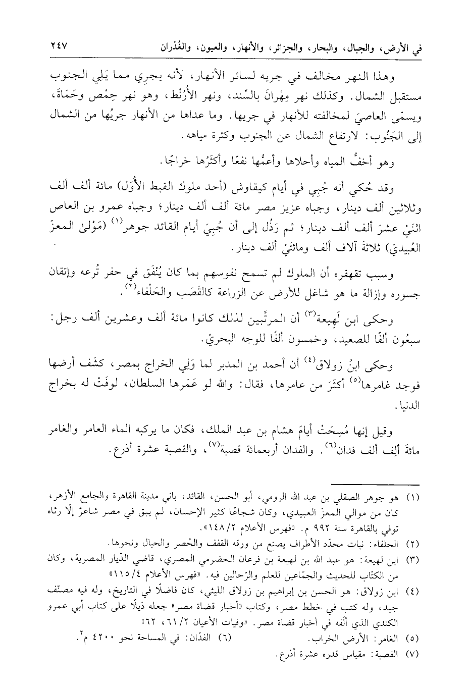 وهذا النهر مخالف في جريه لسائر الأنهار ، لأنه يجري مما يلي الجنوب مستقبل الشمال . وكذلك نهر مهران بالسند ، ونهر الأرنط ، وهو نهر حمص وحماة ، ويسمى العاصي لمخالفته للأنهار في جريها ، وما عداها من الأنهار جريها من الشمال إلى الجنوب : لارتفاع الشمال عن الجنوب وكثرة مياهه .