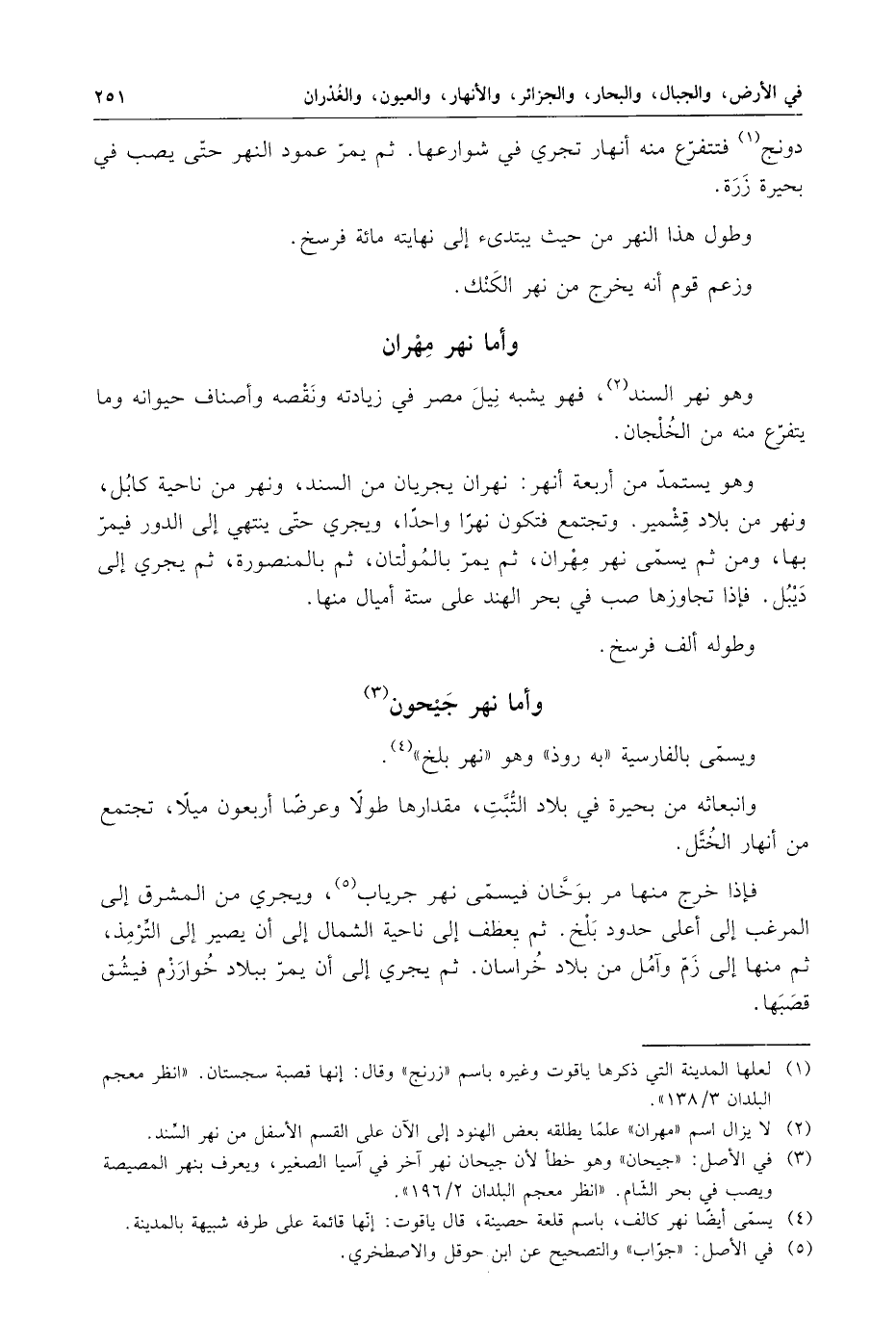 وهو نهر السند ، فهو يشبه نيل مصر في زيادته ونقصه واصناف حيوانه وما يتفرع منه من الخلجان . وهو يستمد من أربعة أنهر : نهران يجريان من السند ، نهر من ناحية كابل ، ونهر من بلاد قشمير . وتجتمع فتكون نهرا واحدا ، ويجري حتى ينتهي إلى الدور فيمر بها ، ومن ثم نهر مهران ، ثم يمر بالمولتان ، ثم بالمنصورة ، ثم يجري إلى ديبل . فإذا تجاوزها صب في بحر الهند على ستة أميال منها .