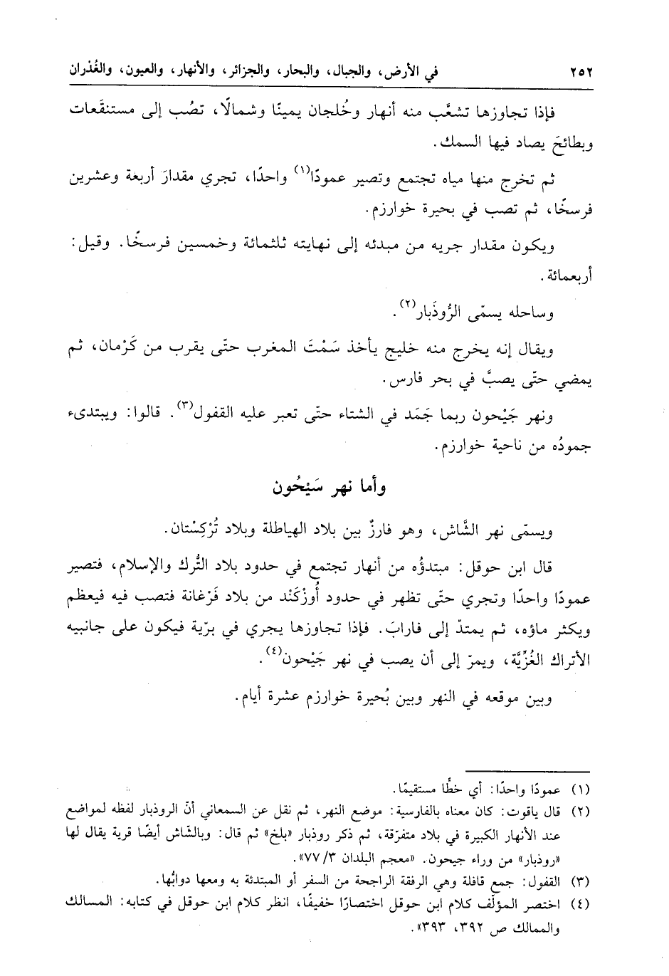 ونهر جيحون ربما جمد في الشتاء حتى تعبر عليه القفول . قالوا : ويبتدئ جموده من ناحية خوارزم .