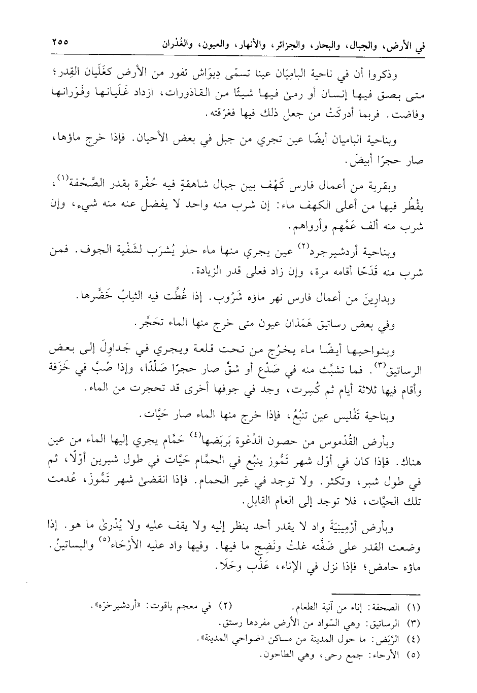 " وفي بعض رساتيق همذان عيون متى خرج منها الماء تحجر .