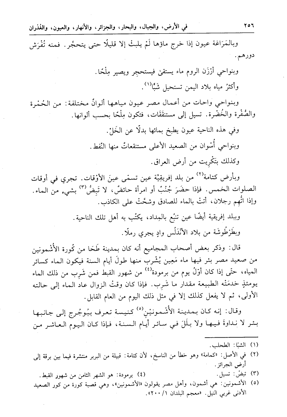 وبنواحي واحات من أعمال مصرعيون مياهها ألوان مختلفة : من الحمرة والصفرة والخضرة . تسيل إلى مستنقعات ، فتكون ملحا بحسب ألوانها .