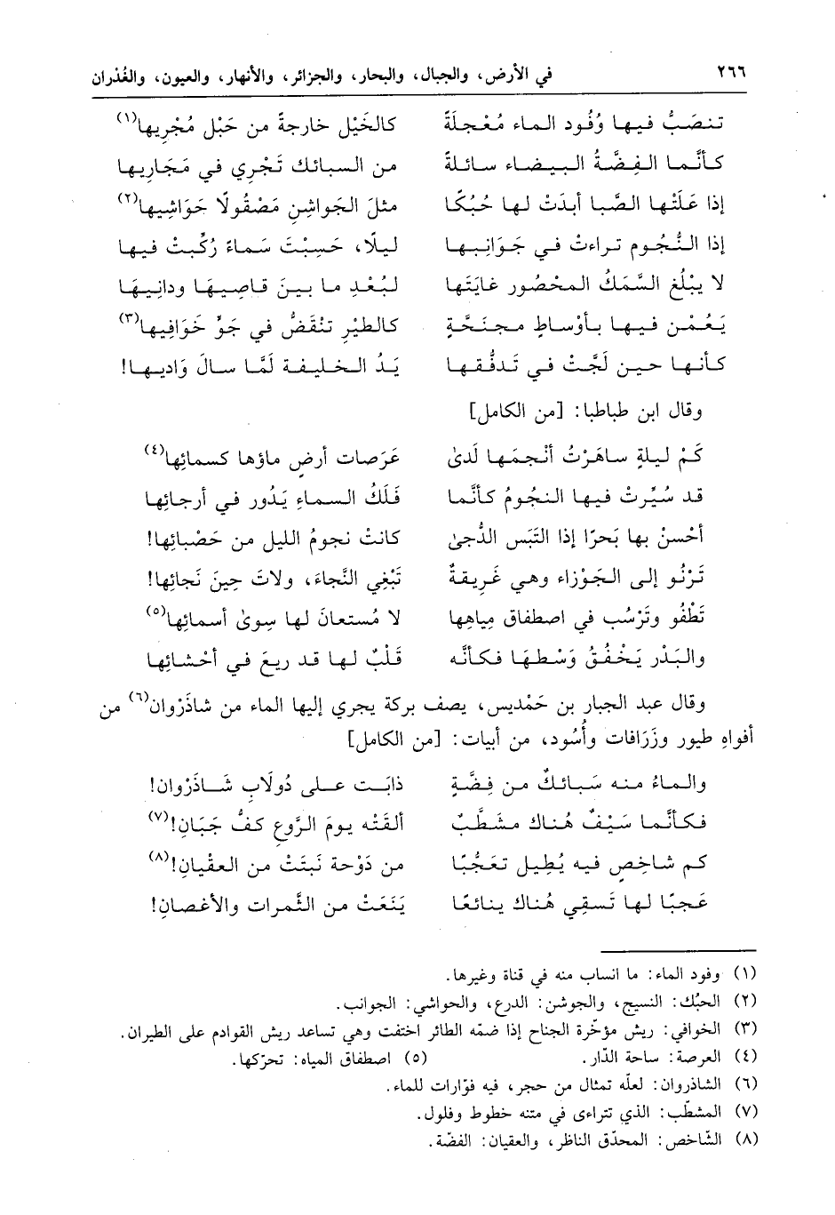 وقال عبد الجبار بن حمديس ، يصف بركة يجري إليها الماء من شاذروان من أفواه طيور وزرافات وأسود ، من أبيات :
