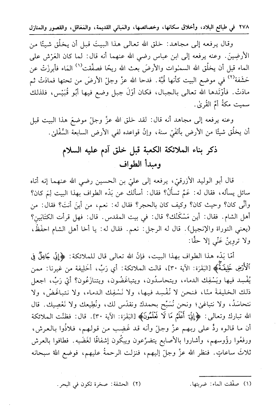 وقال أبو الوليد الأزرقي ، يرفعه إلى على بن الحسين رضي الله عنهما إنه أتاه سائل يسأله ، فقال له : عم تسأل ؟ فقال : أسألك عن بدء الطواف بهذا البيت لم كان ؟ وأنى كان ؟ وحيث كان ؟ وكيف كان بالحجر ؟ فقال له : نعم ، ومن أين أنت ؟ فقال : من أهل الشام . فقال : أين مسكنك ؟ قال : في بيت المقدس . فهل قرأت الكتابين ؟ " يعني التوراة والإنجيل " . قال له الرجل : نعم . فقال له : يا أخا أهل الشام احفظ ، ولا تروين عني إلا حقا : أما بدء هذا الطواب بهذا البيت ، فإن اله تعالى قال للملائكة : " إني جاعل في الأرض خليفةً " ، قالت الملائكة : أي رب ، أخليقة من غيرنا : ممن يفسد فيها ويسفك الدماء ويتحاسدون ، ويتباغضون ، ويتنازعون ؟ أي رب ، اجعل ذلك الخليفة منا ، فنحن لا نفسد فيها ، ولا نسفك الدماء ، ولا نتباغض ، ولا نتحاسد ، ولا نتباغى ؛ ونحن نسبح بحمدك ونقدس لك ، ونطيعك ولا نعصيك . قال الله تبارك وتعالى : " إني أعلم ما لا تعلمون " . قال : فظنت الملائكة أن ما قالوه رد على ربهم عز وجل وأنه قد غضب من قولهم ، فلاذوا بالعرش ، ورفعوا رءوسهم ، وأشاروا بالأصابع يتضرعون ويبكون إشفافا لغضبه . فطافوا بالعرش ثلاث ساعات فنظر الله عز وجل إليهم ، فنزلت الرحمة عليهم ، فوضع الله سبحانه